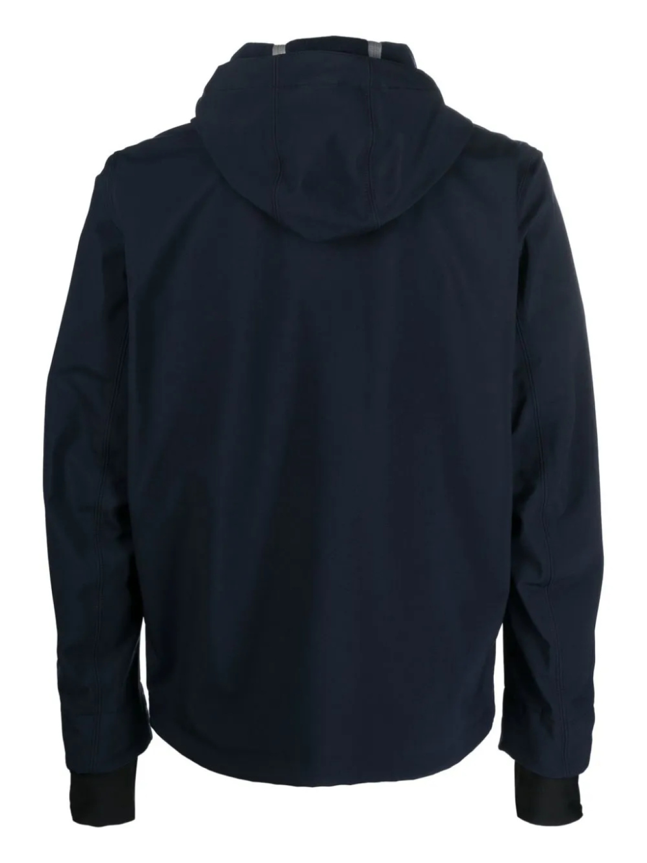 Темно-синий, нашивка с логотипом на груди, отделка лентой с логотипом, классический капюшон, застежка на молнии спереди, длинные рукава и прямой подол.