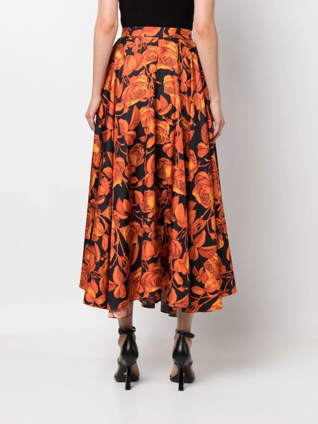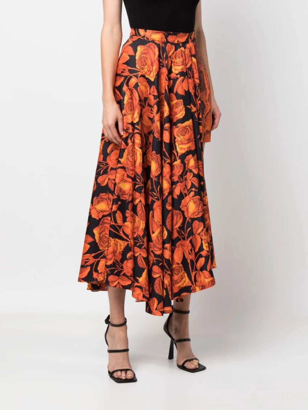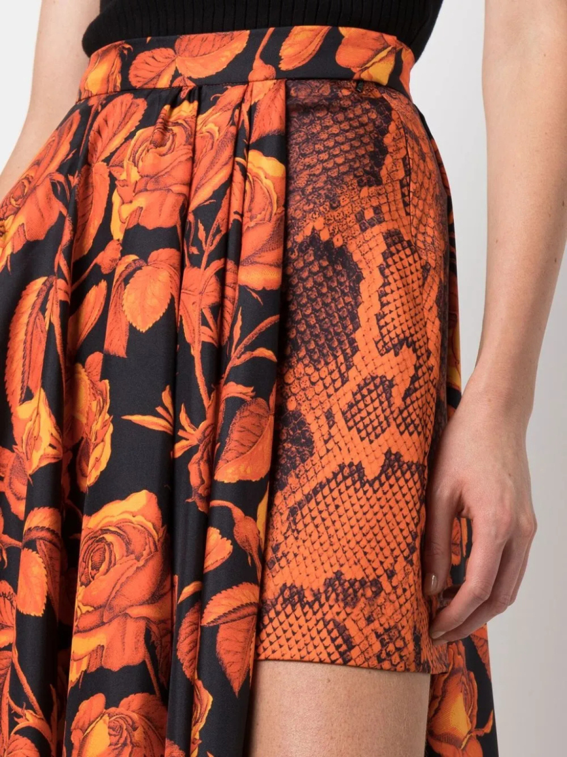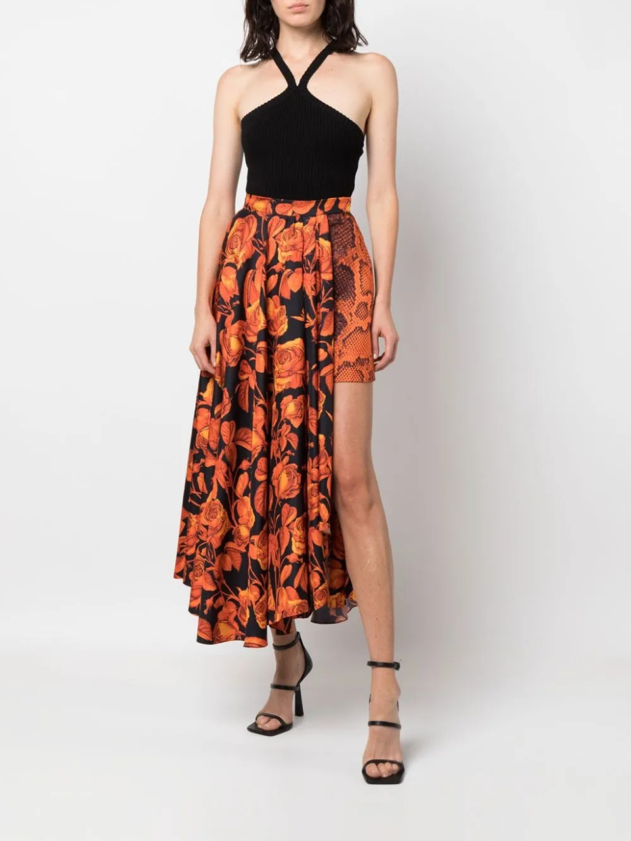 Оранжевый, разноцветный, шелк, сплошной цветочный принт, змеиный принт, завышенная талия и асимметричная форма.