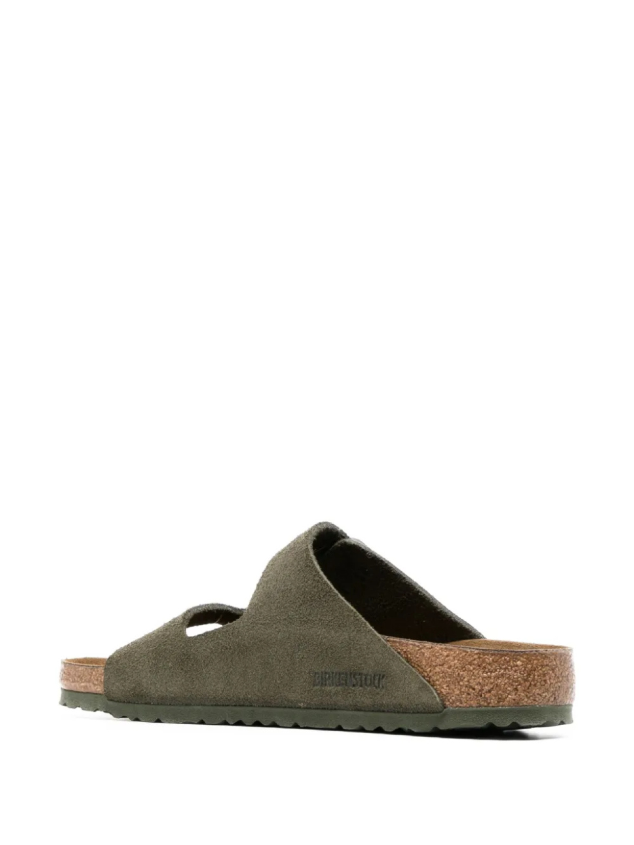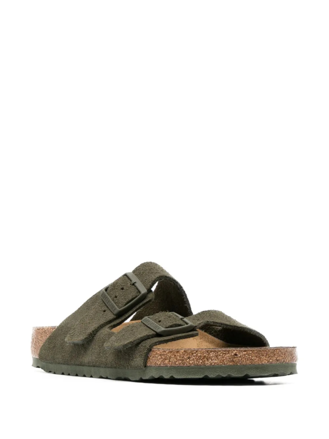 Серо-зеленый, замша, браслет в два оборота, открытый носок, два ремешка с застежкой на пряжке, формованная стелька, пробковая подошва и резиновая подошва.