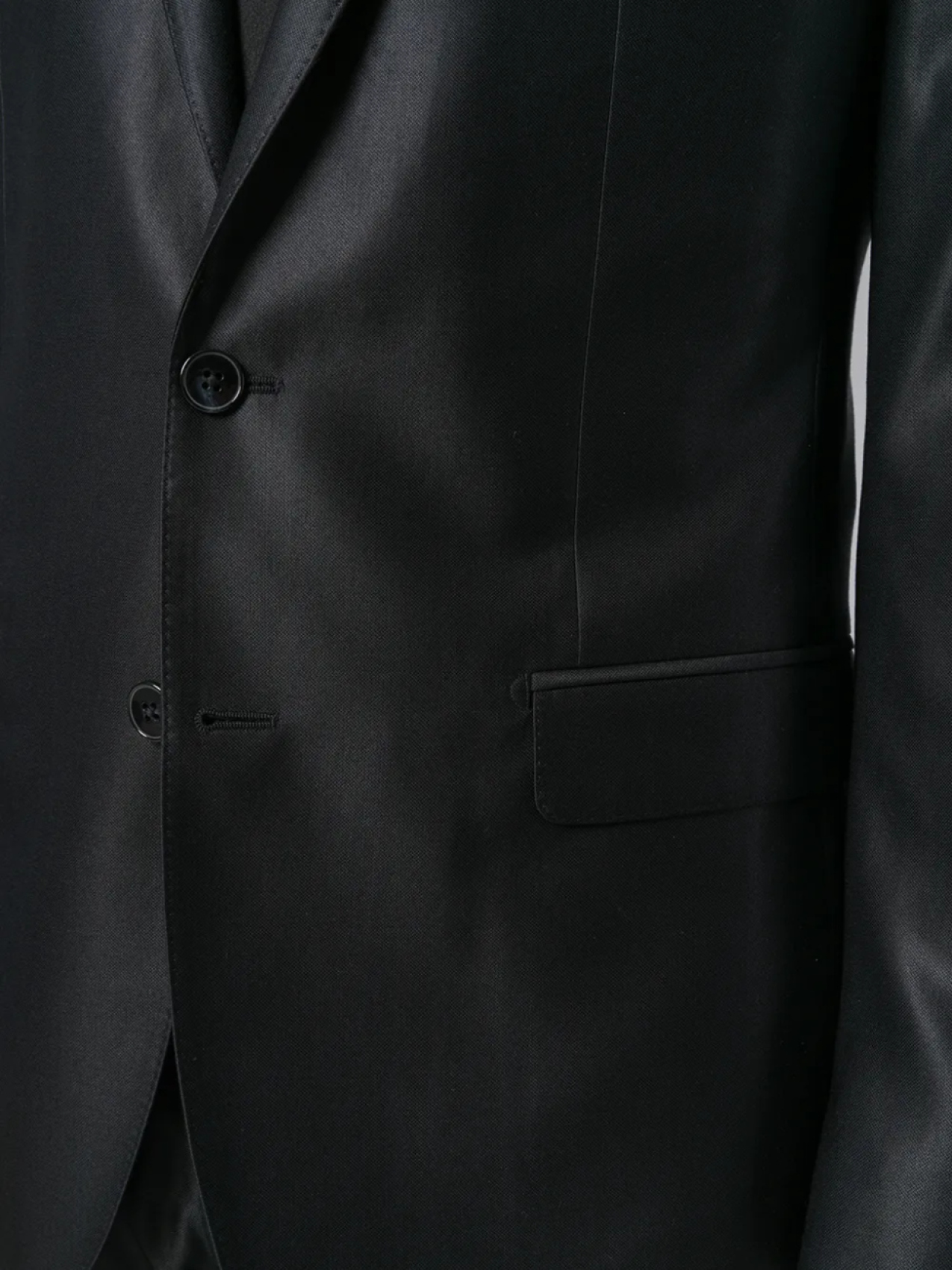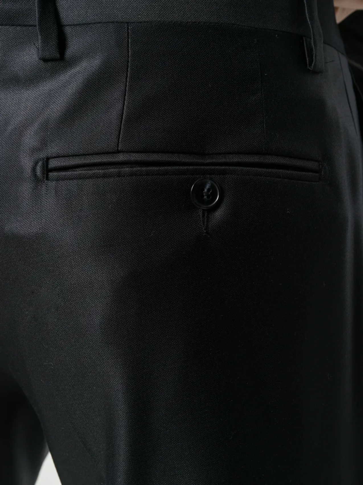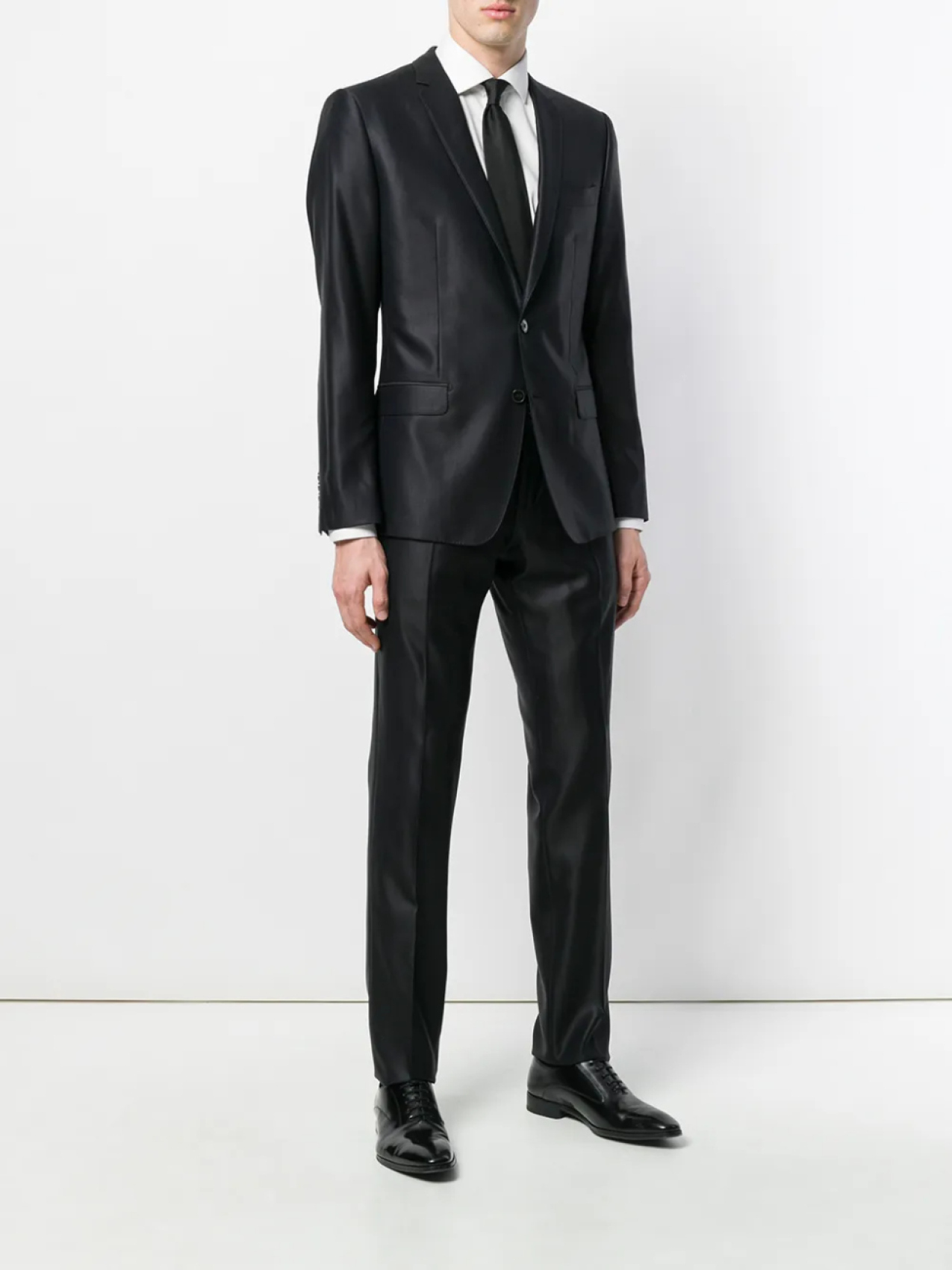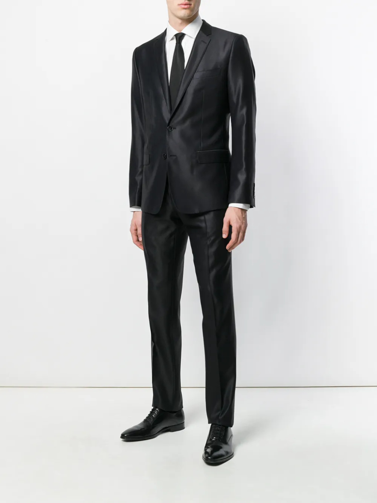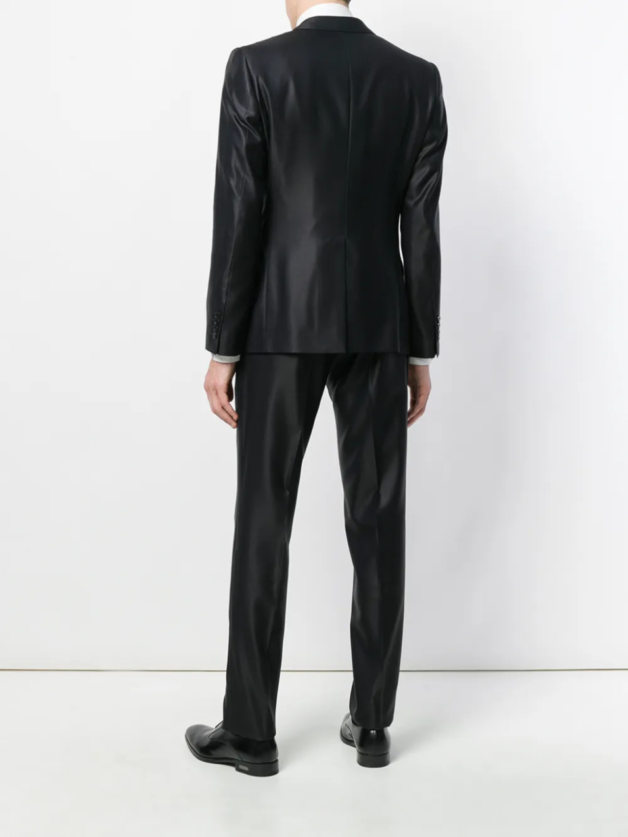 Подробнее о товаре: Черный костюм-двойка 'Martini-Fit' из микса шелка и натуральной шерсти от Dolce & Gabbana(Дольче Габбана). Заостренные лацканы, застежка на пуговицах спереди, длинные рукава, манжеты на пуговицах, нагрудный карман, передние карманы с клапанами, разрез на кайме сзади, пояс с петлями для ремня, потайная застежка спереди, боковые карманы по шву, задние карманы с листочкой на пуговицах, узкий крой.