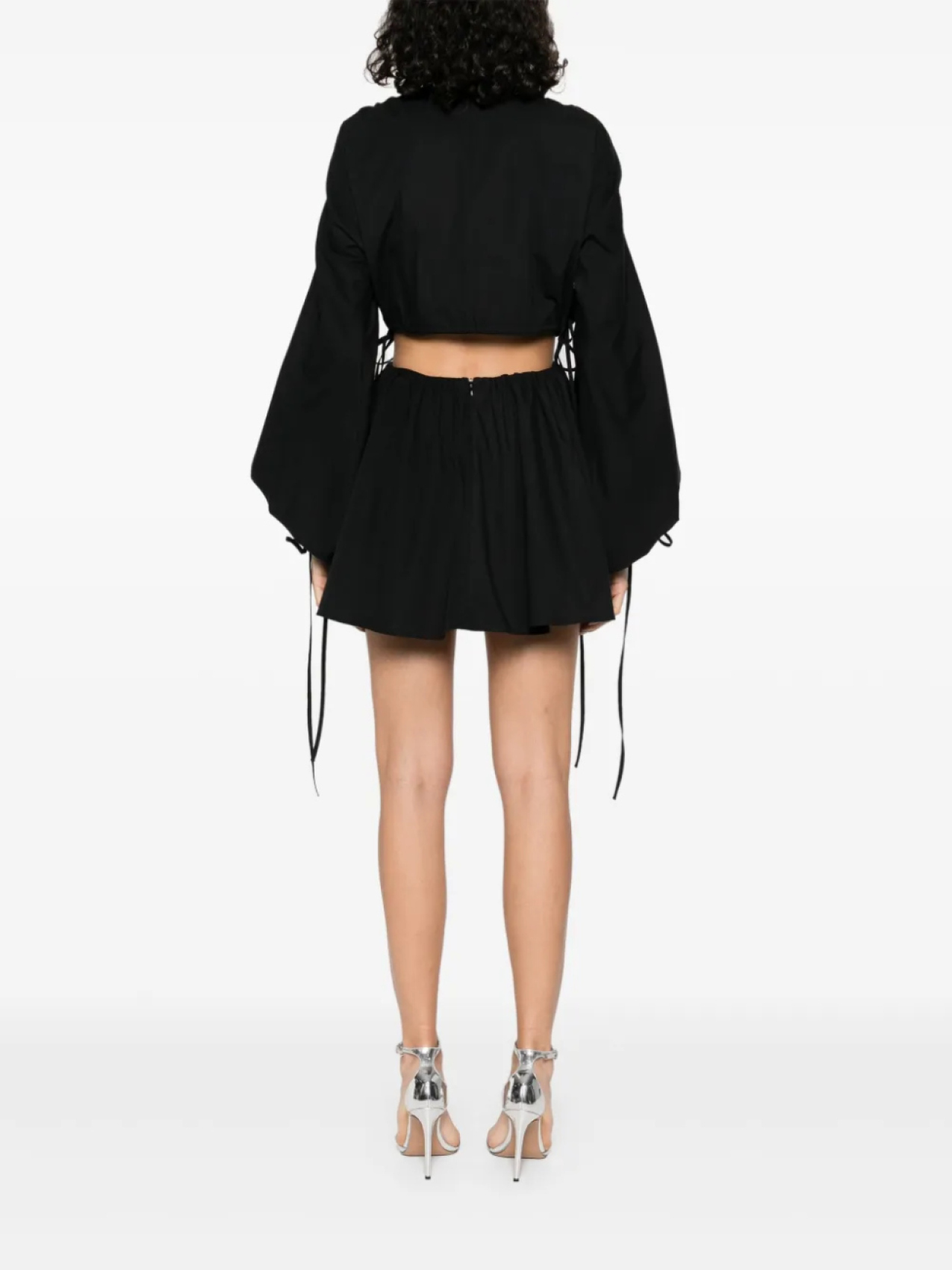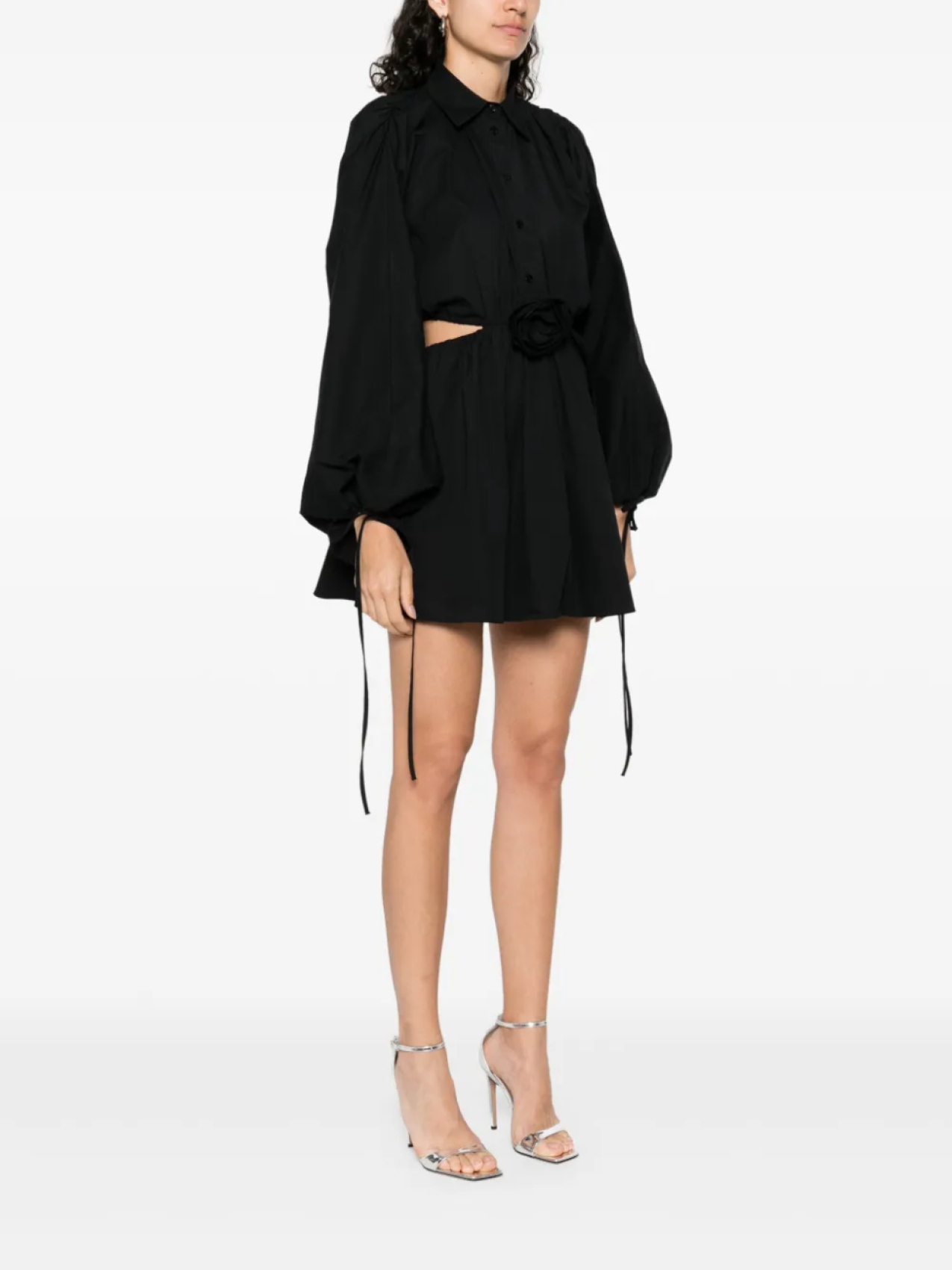 Черная планка на пуговицах спереди, потайная застежка-молния сзади, рукава-бишоп, вырезы