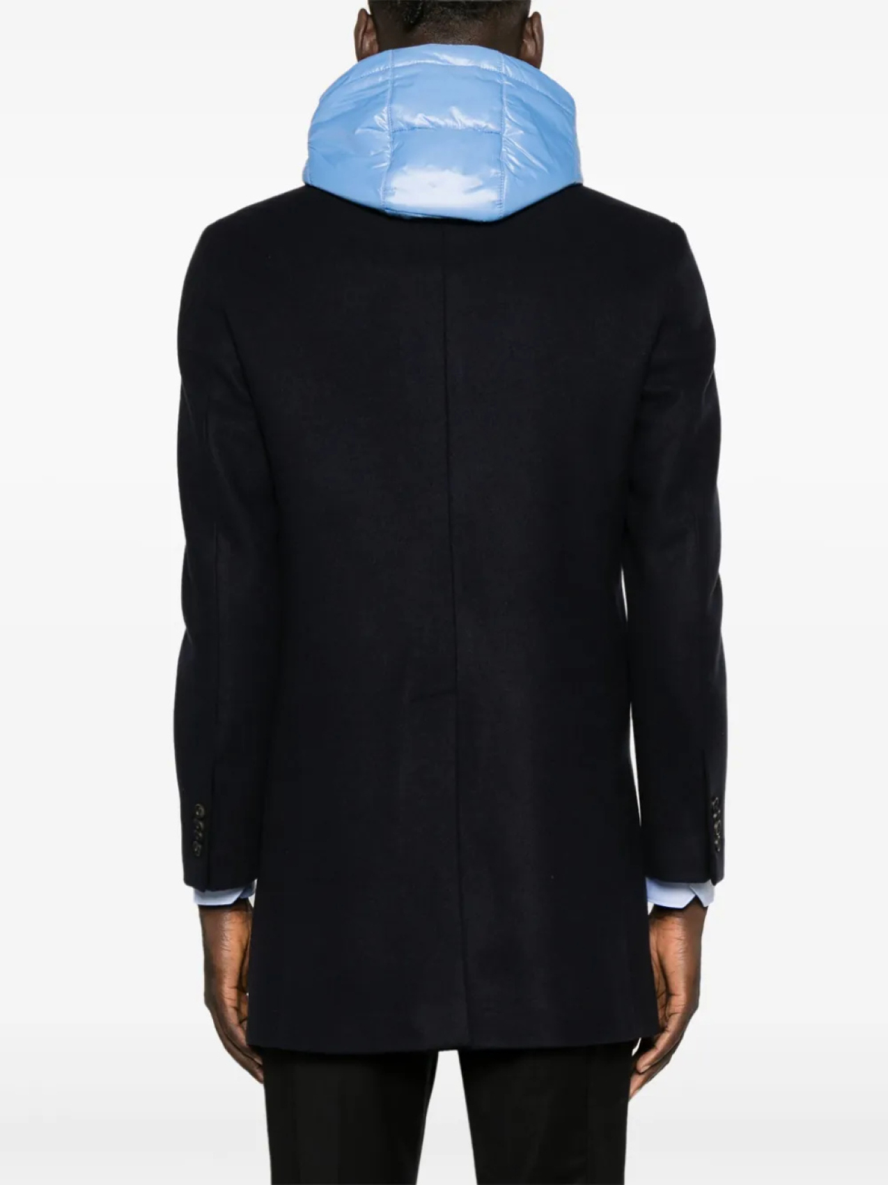 Темно-синий, васильковый, многослойная деталь, декоративная брошь, классический капюшон, зазубренные лацканы, застежка на молнии и пуговице спереди, длинные рукава, манжеты на пуговицах, два прорезных кармана сбоку, внутренние накладные карманы, шлица по центру сзади, прямой подол, длина до бедер и атласная подкладка.