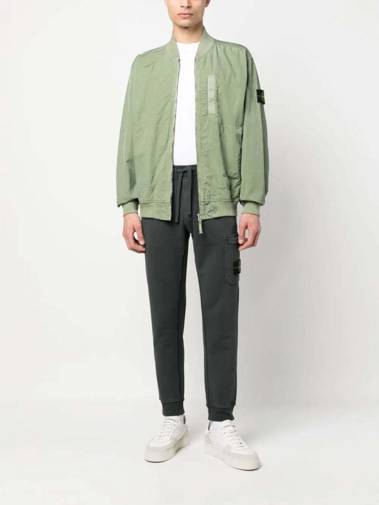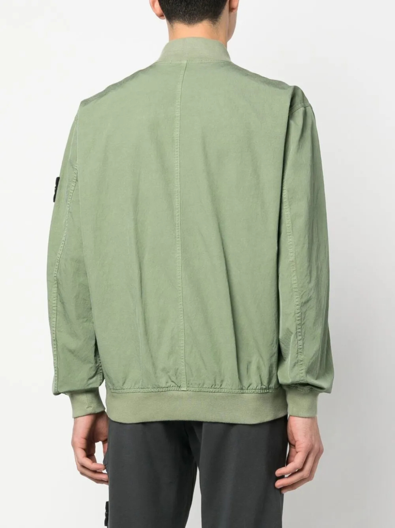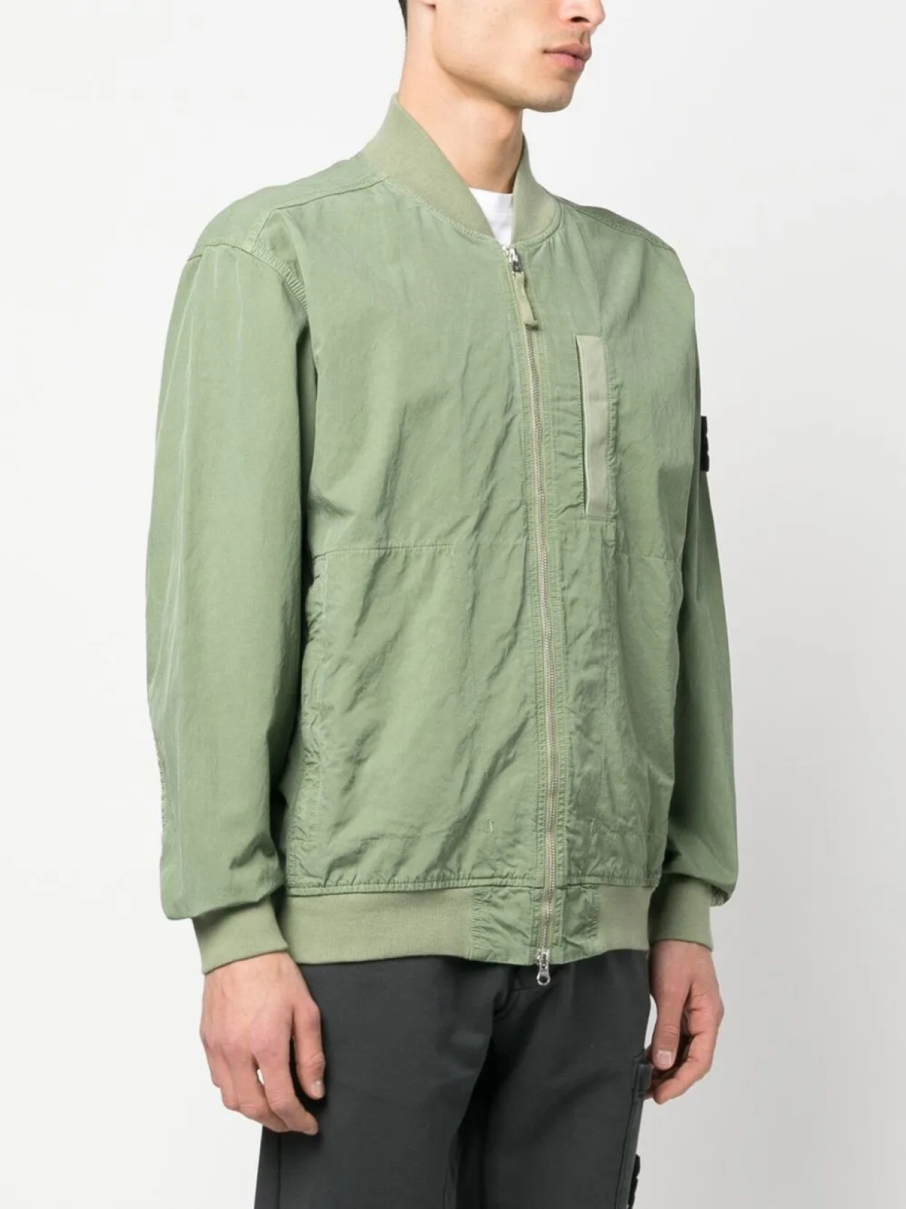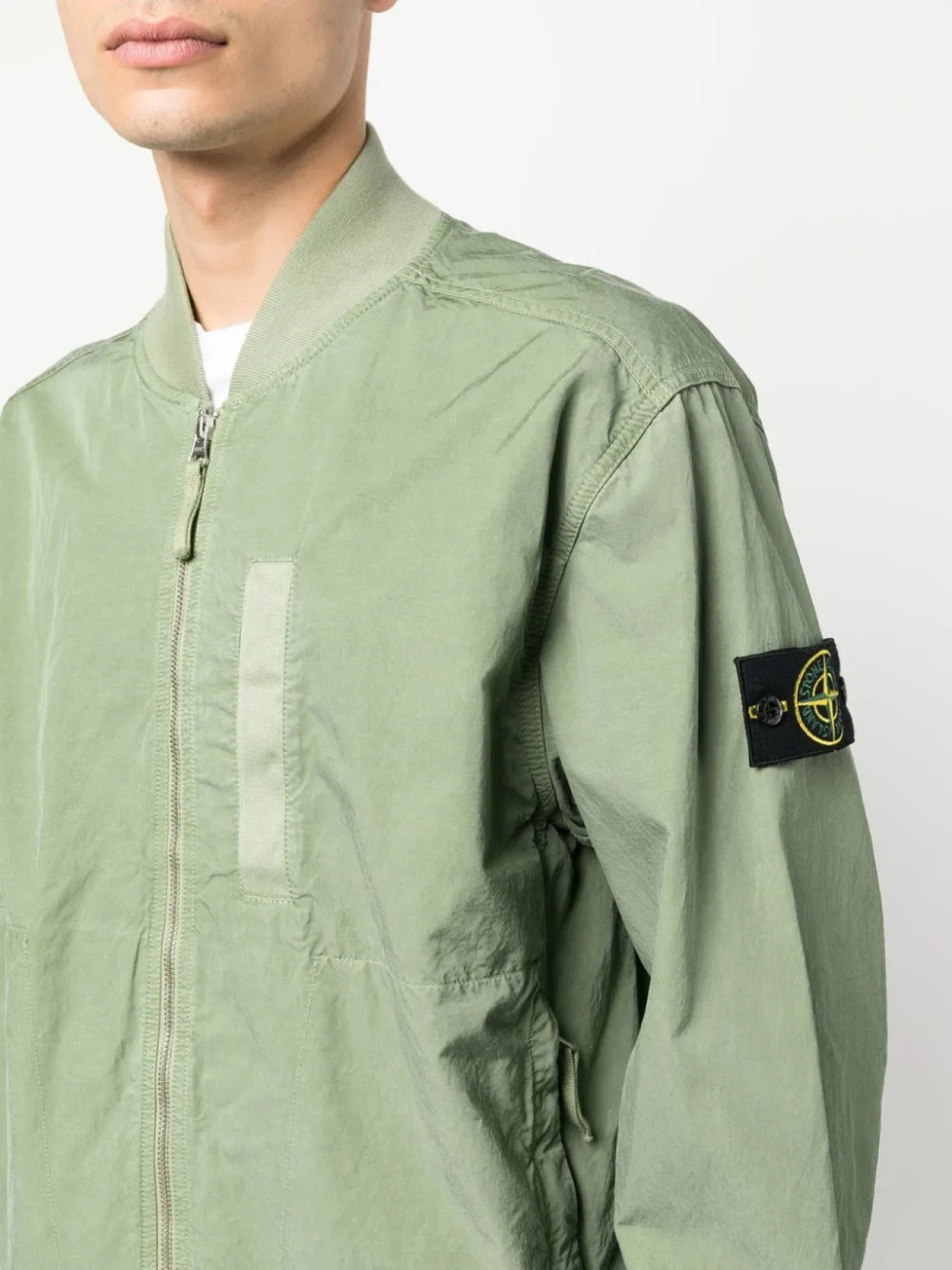 Зеленый, знаковая деталь в виде компаса, воротник-стойка в рубчик, застежка на молнии спереди, прорезной карман на груди, два вшитых кармана по бокам и длинные рукава.