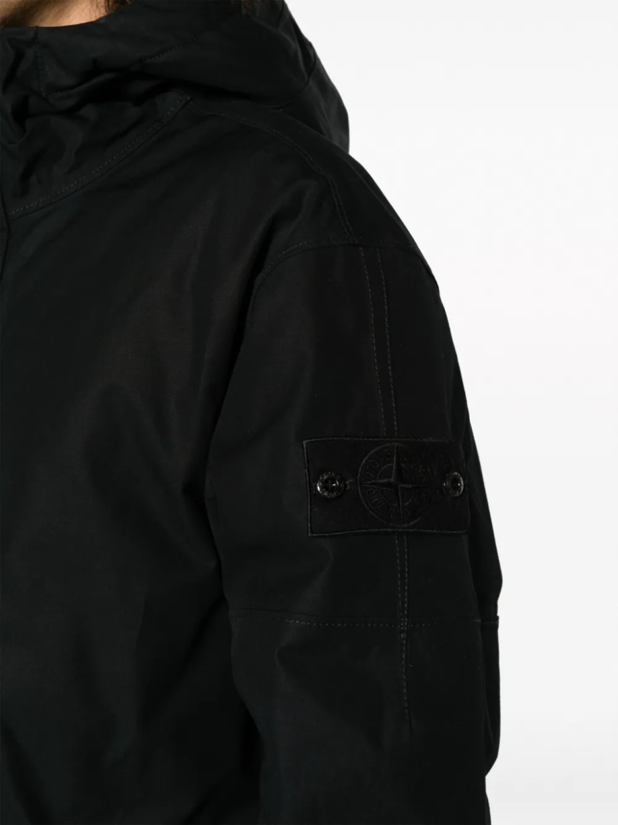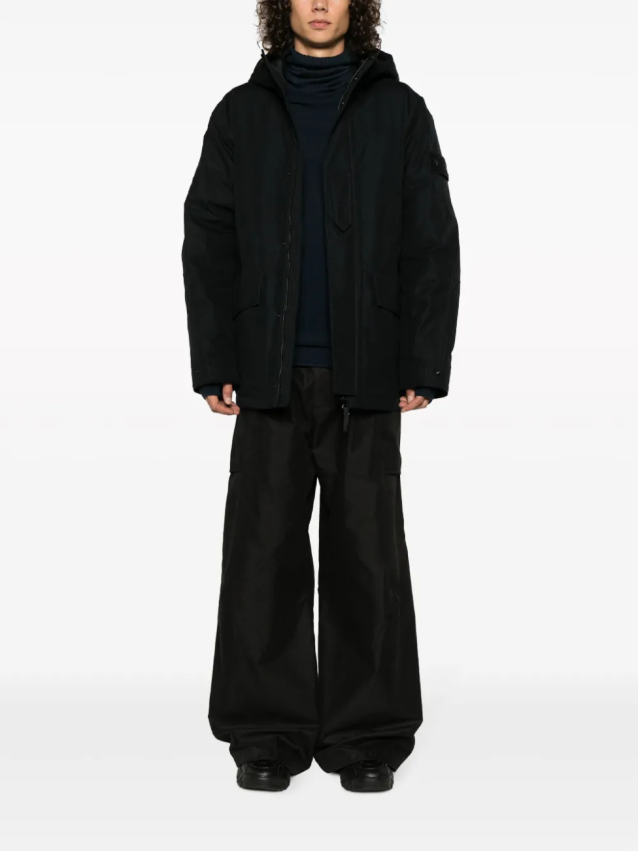 Черный, хлопок, окрашивание готовой вещи по технологии garment dye, знаковая деталь в виде компаса, классический капюшон, потайная застежка спереди, два передних кармана с клапанами, длинные рукава, манжеты на пуговицах и прямой подол.