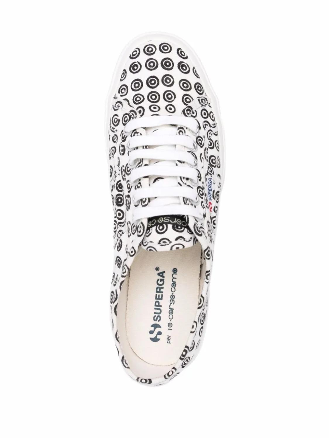 Сплошной графичный принт, закругленный носок, шнуровка спереди, нашивка с логотипом на язычке, стелька с логотипом и плоская резиновая подошва.