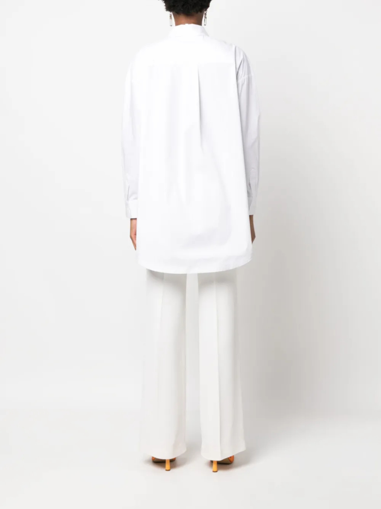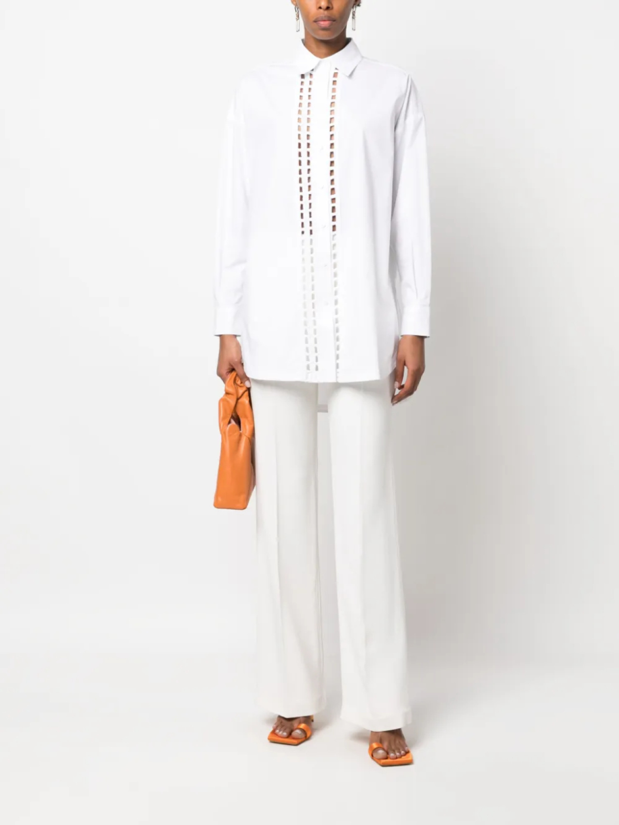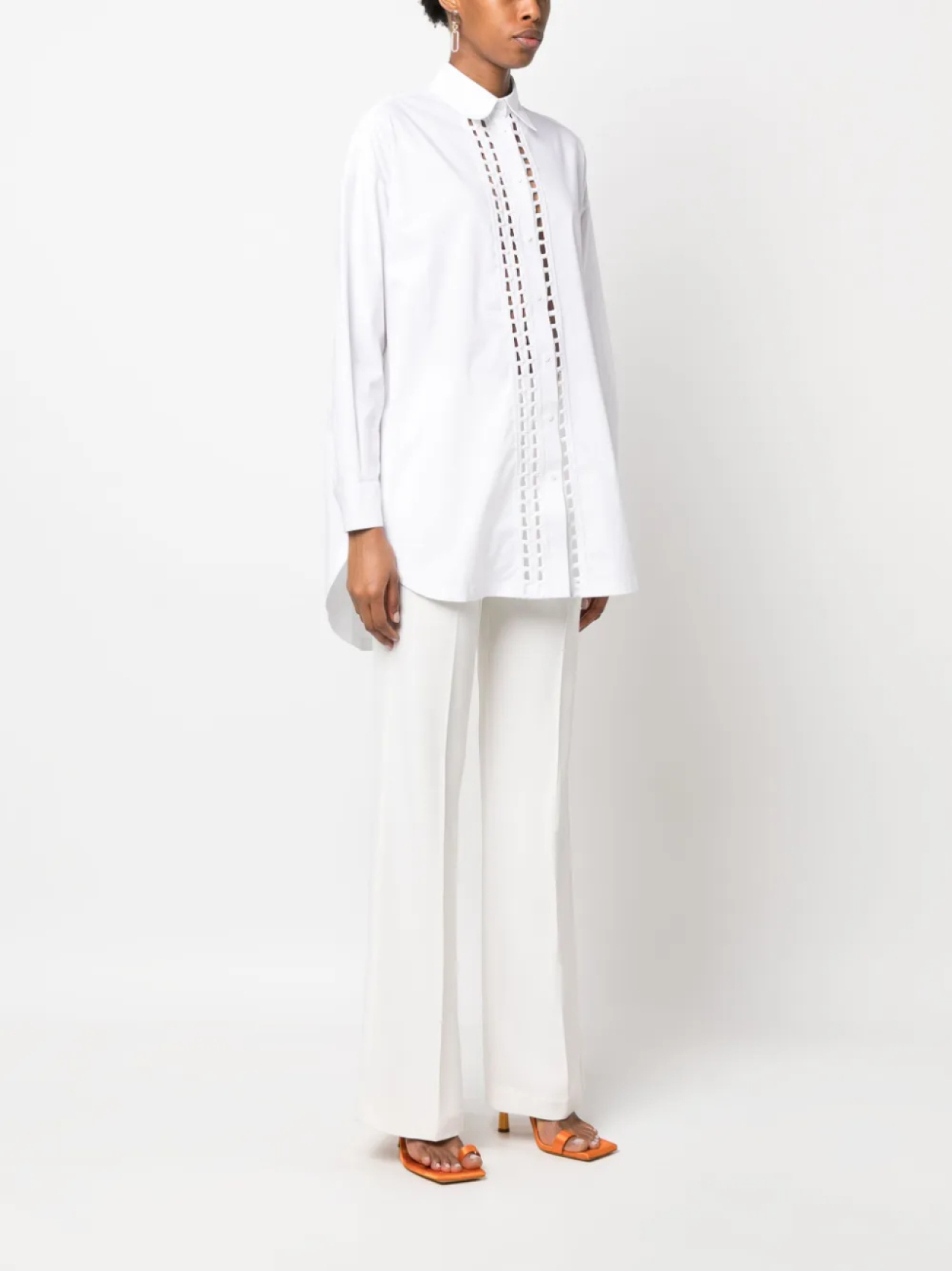 Белый, эластичный хлопок, перфорация, вышитые края, классический воротник, застежка на пуговицах спереди, длинные рукава, манжеты на пуговицах и закругленный подол сзади.