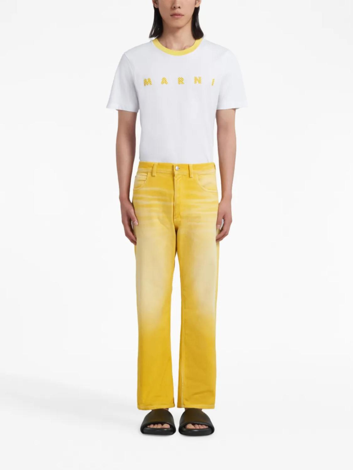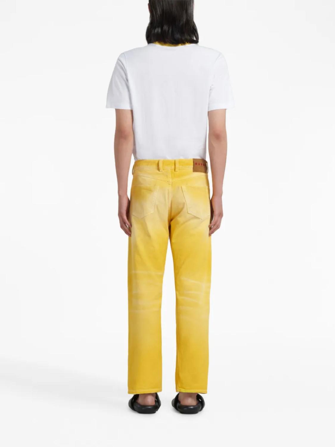 Обработанный деним, декоративные складки, нашивка с логотипом сзади, петли для ремня, ширинка на пуговицах, прямой крой, пять карманов и прямой подол.