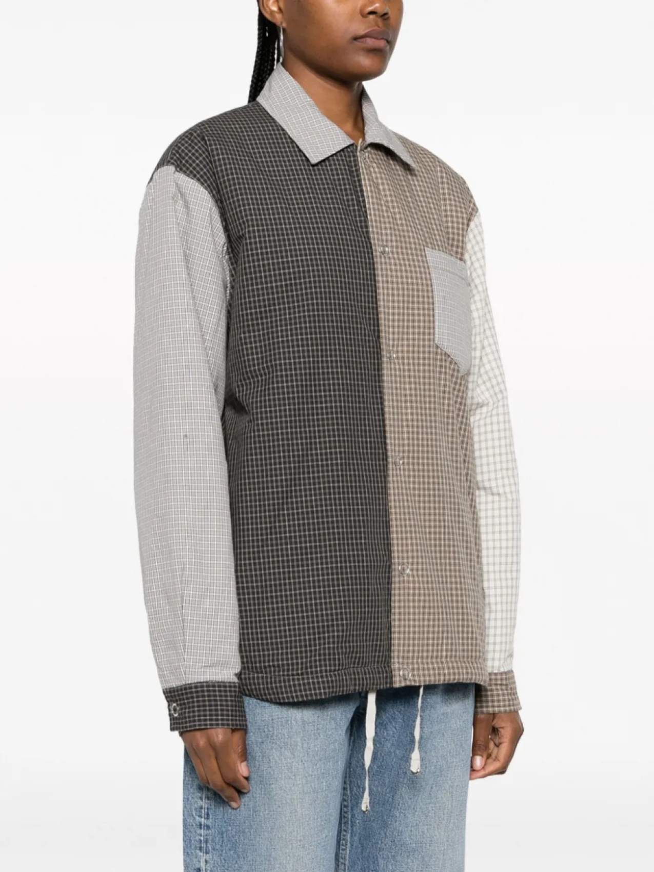 Расцветка Light Brown, темно-зеленый, светло-серый, хлопок, клетчатый узор, дизайн колор-блок, металлический логотип бронзового оттенка, отложной воротник, застежка на кнопках спереди, приспущенные плечи, длинные рукава, манжеты с застежкой на кнопки и подол с кулиской.
