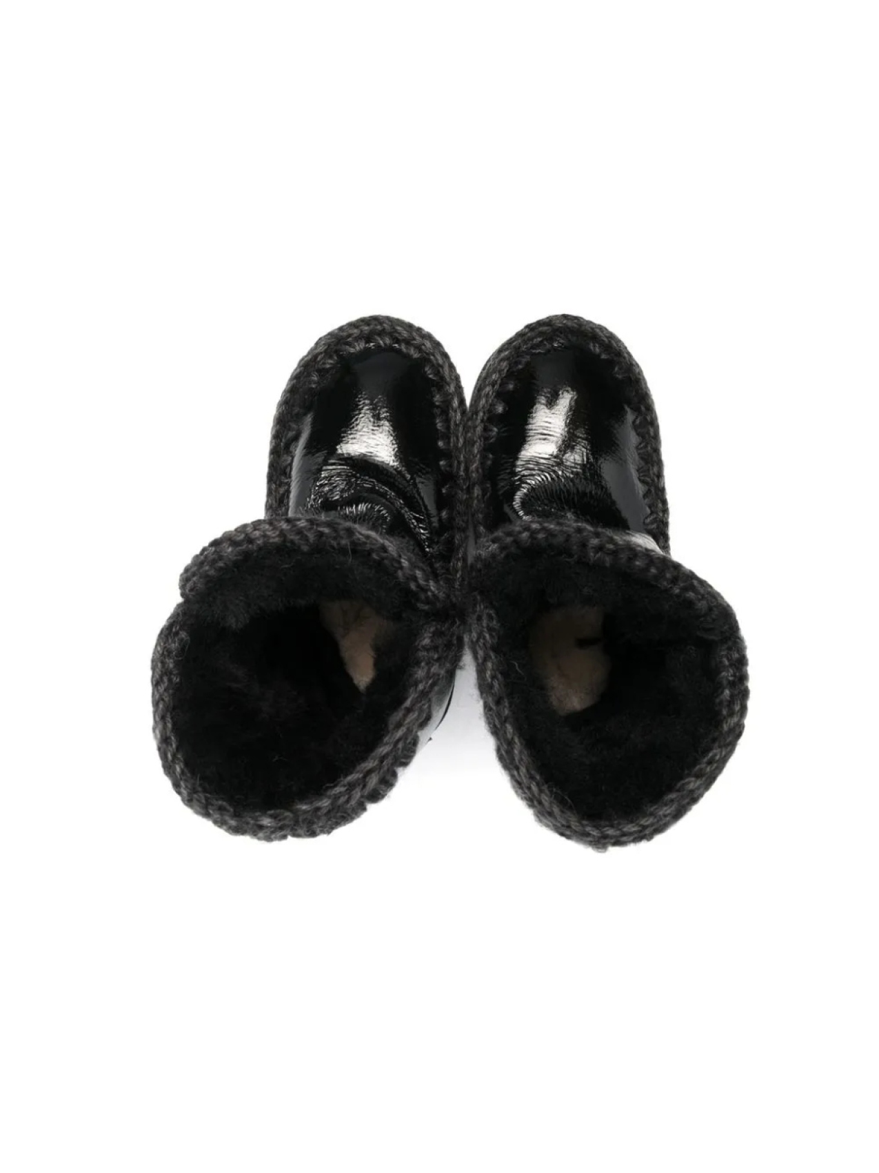 Черный, лакированная телячья кожа, подкладка из овечьей шерсти, строчка в тон, нашивка с логотипом сзади, модель без застежки, закругленный носок и плоская резиновая подошва.