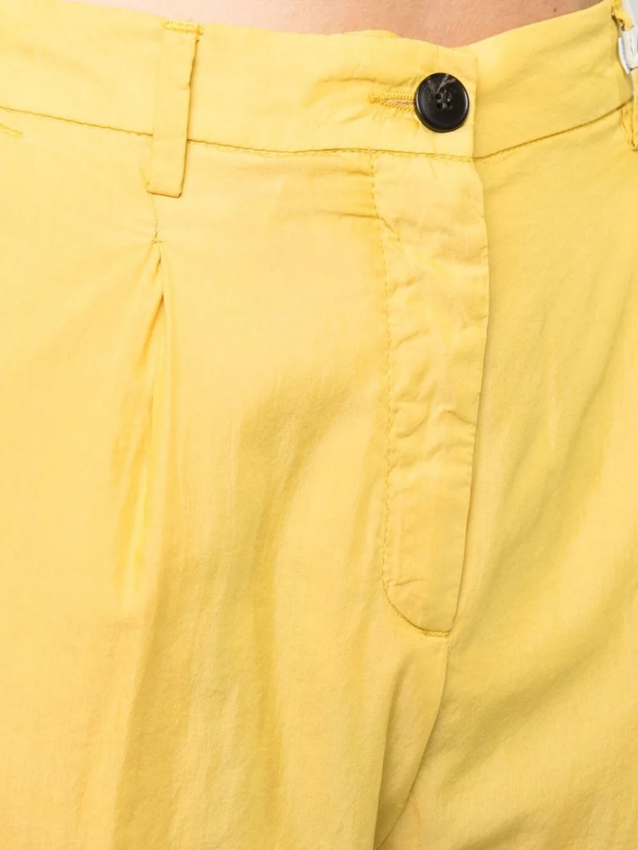 Горчично-желтый, смесовый хлопок, укороченная длина, широкий крой, застежка на пуговицы, петли для ремня и два кармана с листочкой сзади.