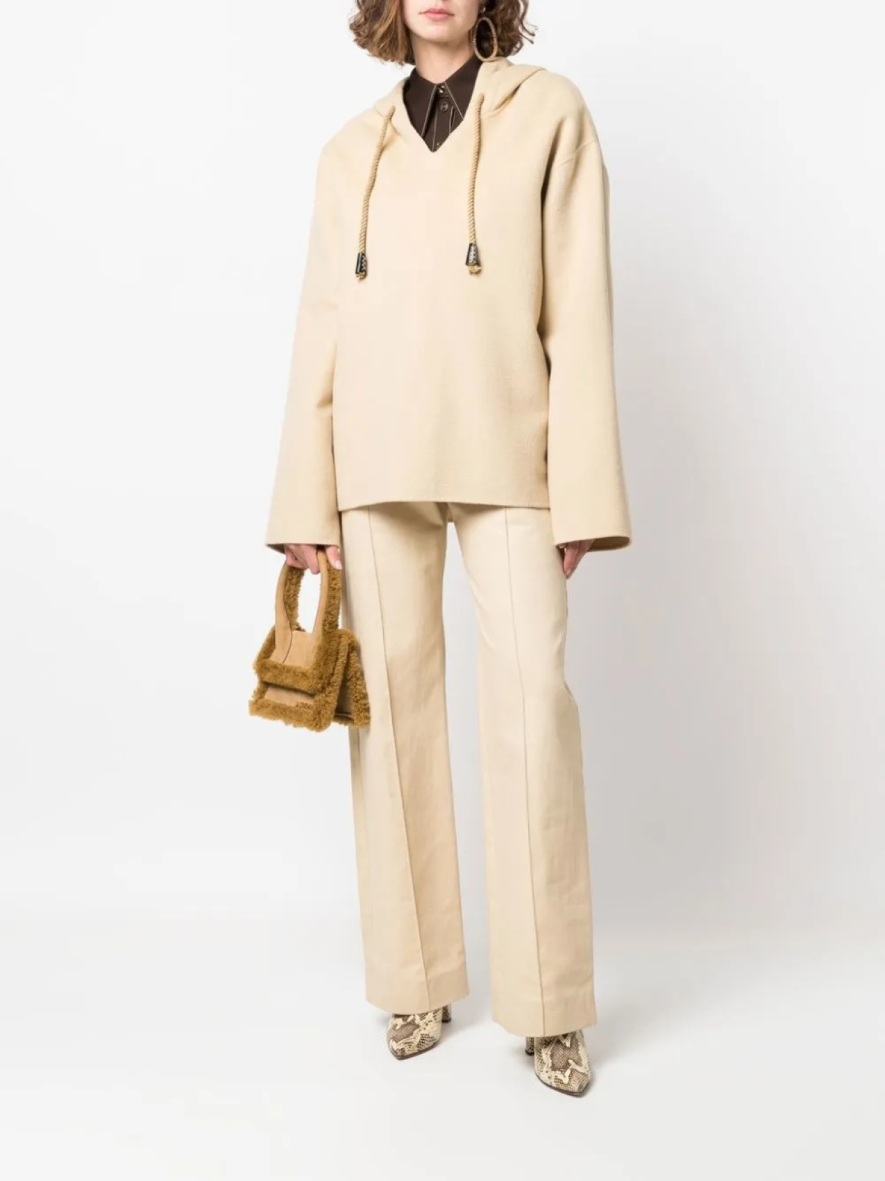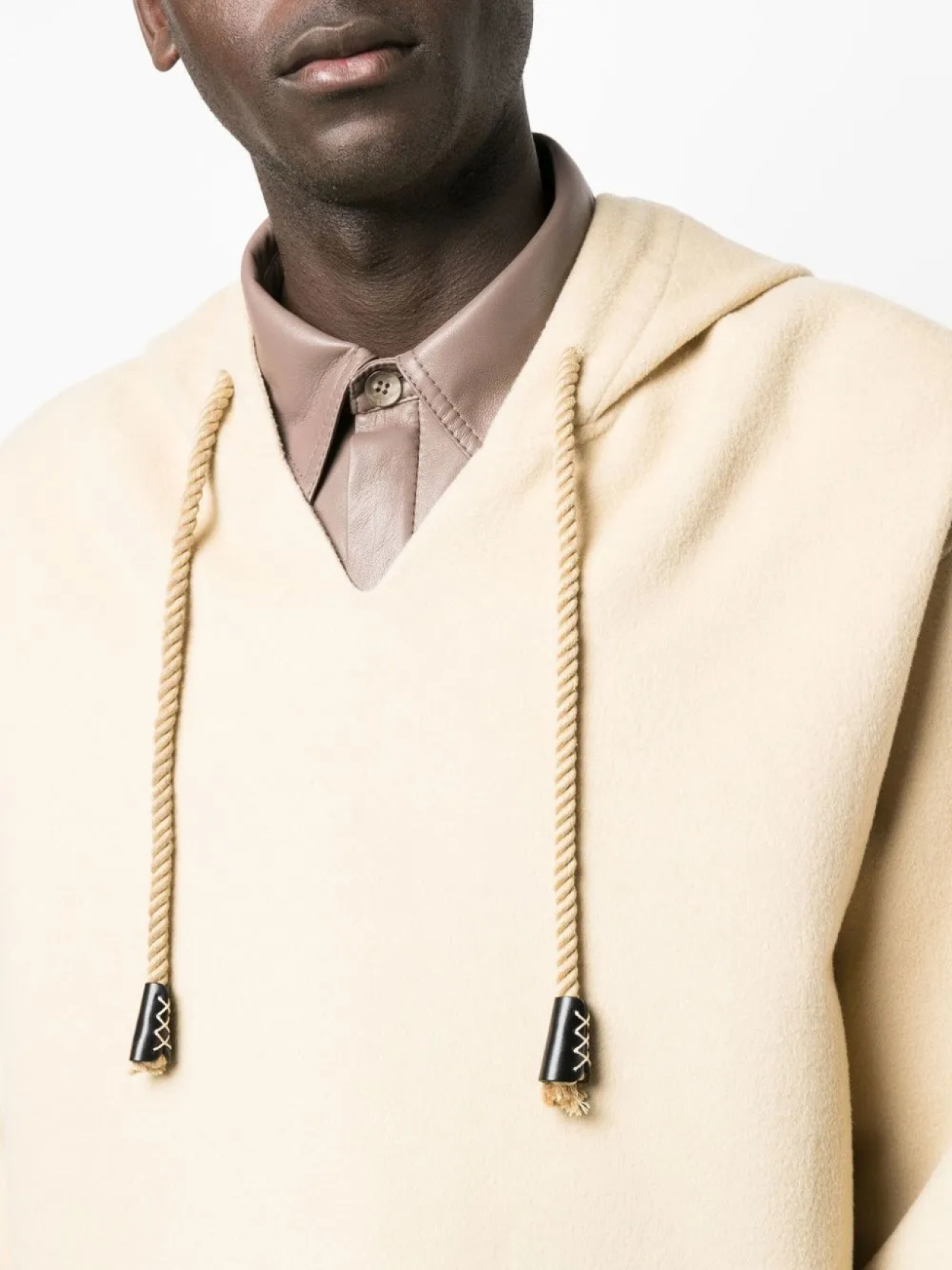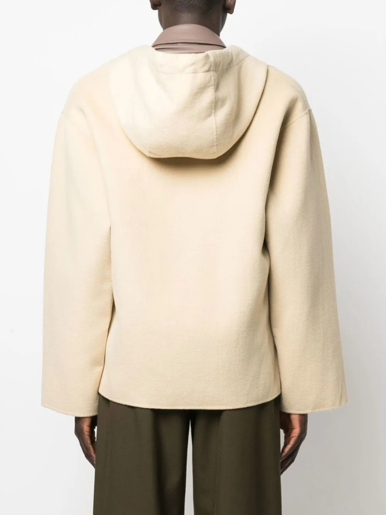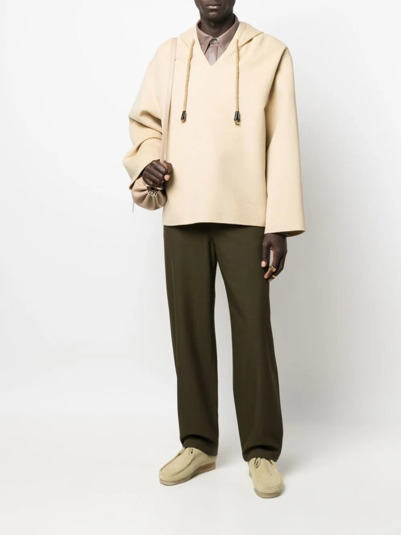 Светло-бежевый, хлопок, затягивающийся на шнурок капюшон, приспущенные плечи и длинные широкие рукава.