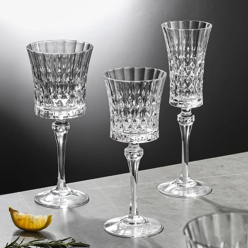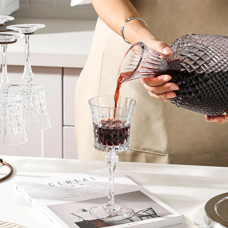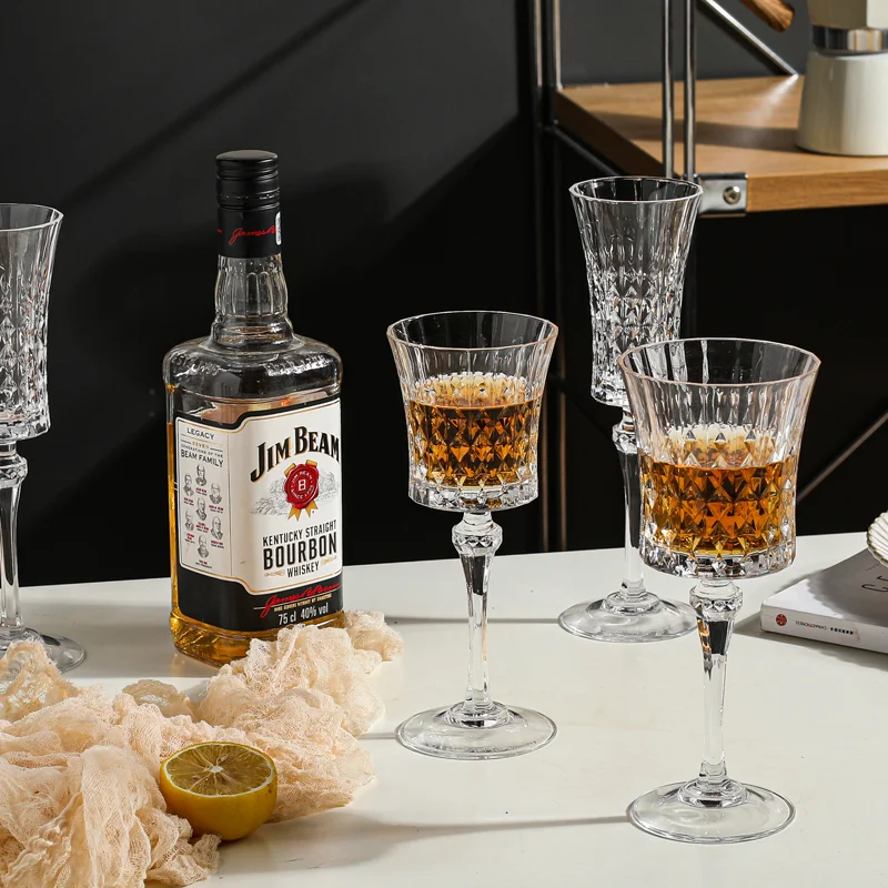 Фужер имеет элегантный дизайн с граненым узором на чаше, что придает ему изысканный вид.