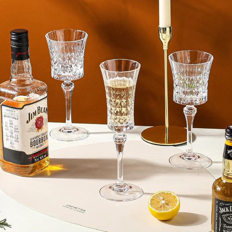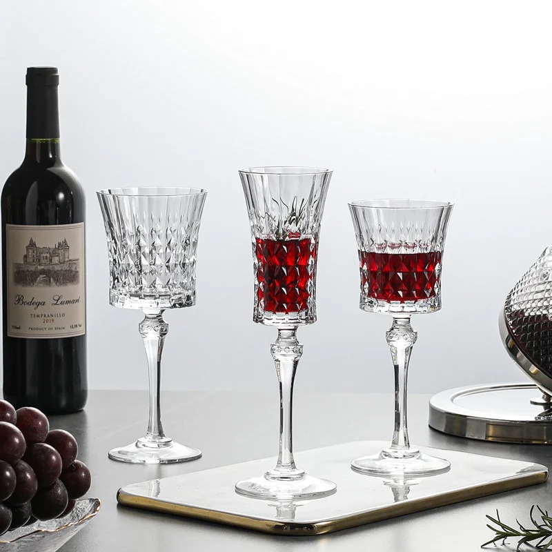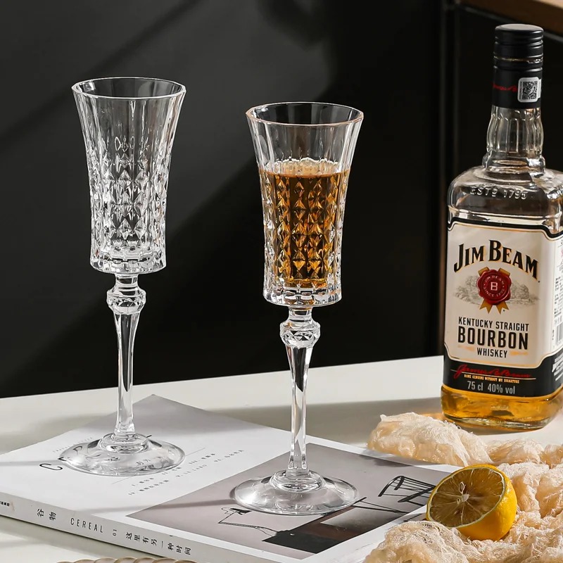 Фужер имеет элегантный дизайн с граненым узором на чаше, что придает ему изысканный вид.