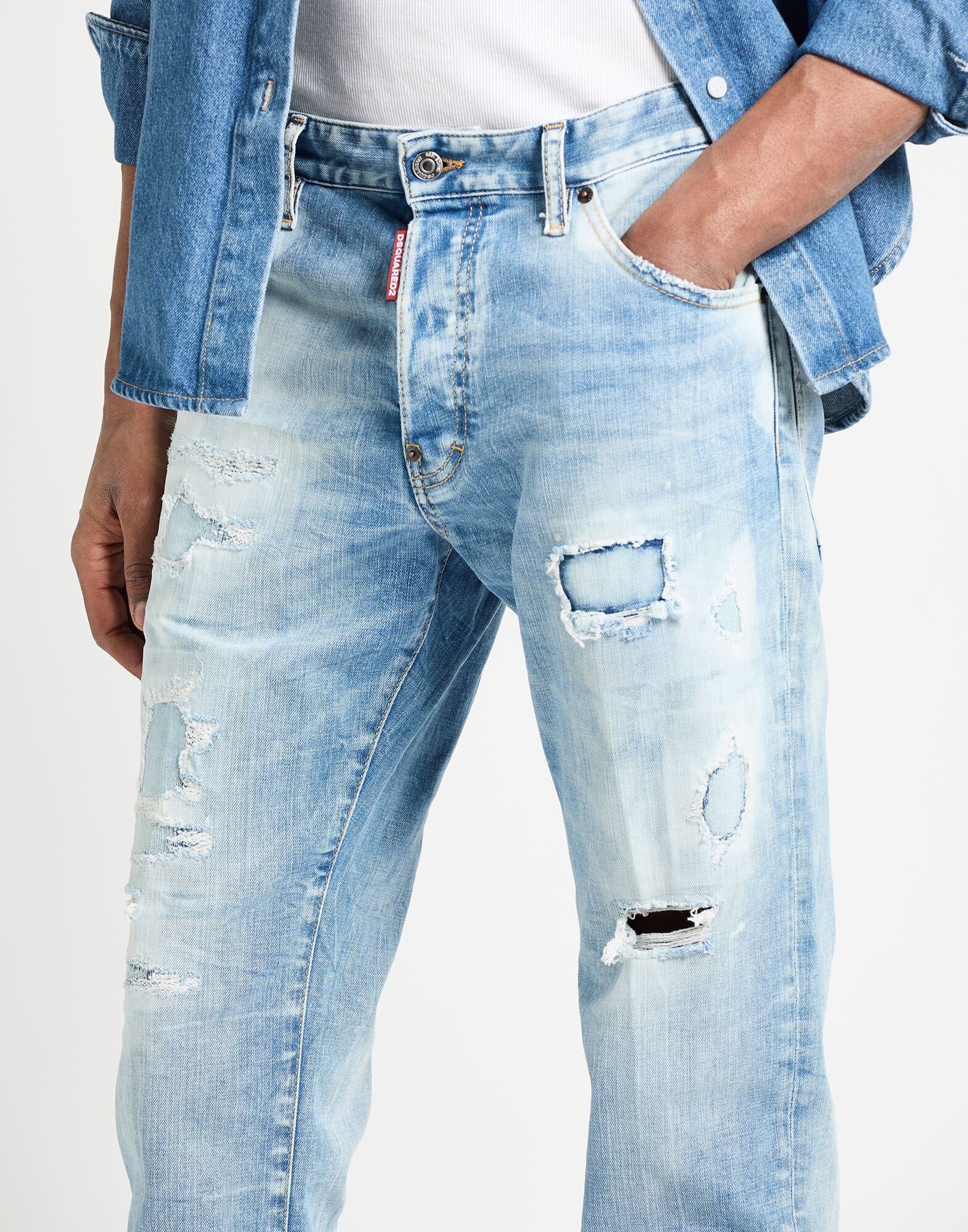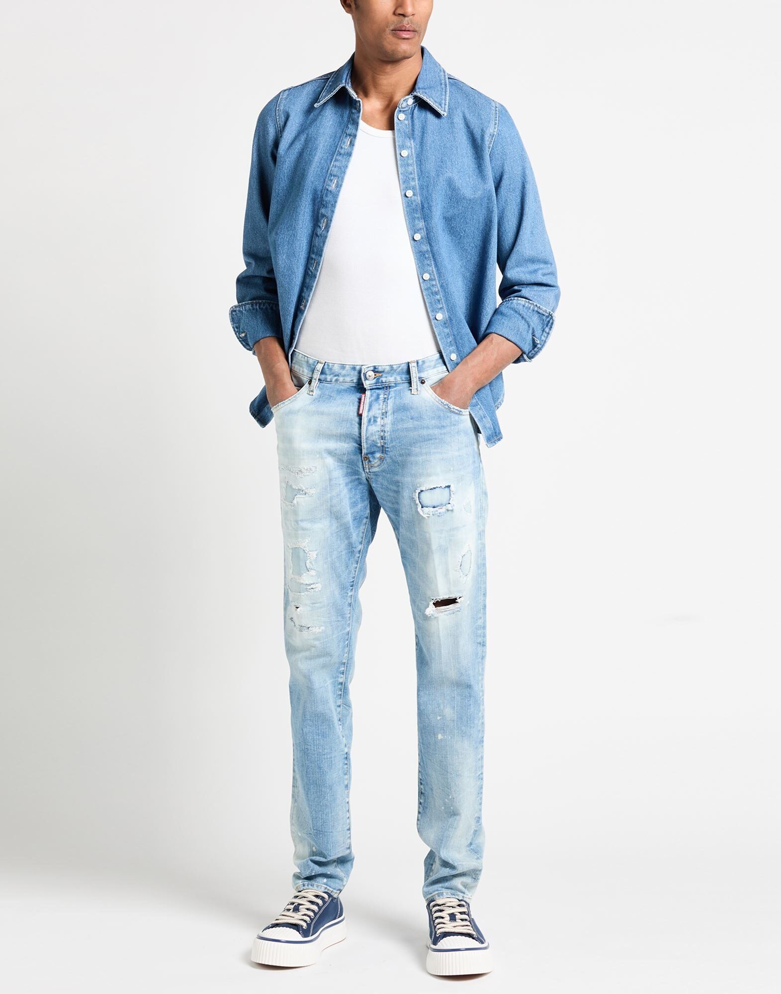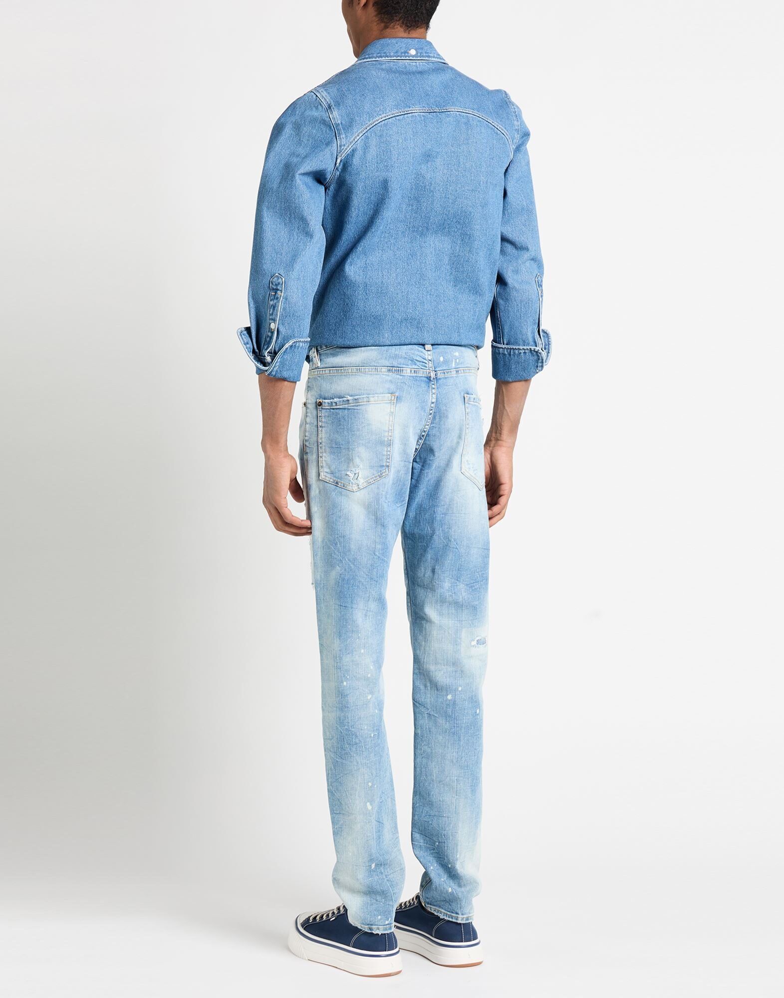 Деним, выцветший, логотип бренда, металлические аппликации, однотонный, средняя стирка, средняя посадка, зауженные штанины, стандартный крой, застежка на пуговицы, множество карманов, узкая модель