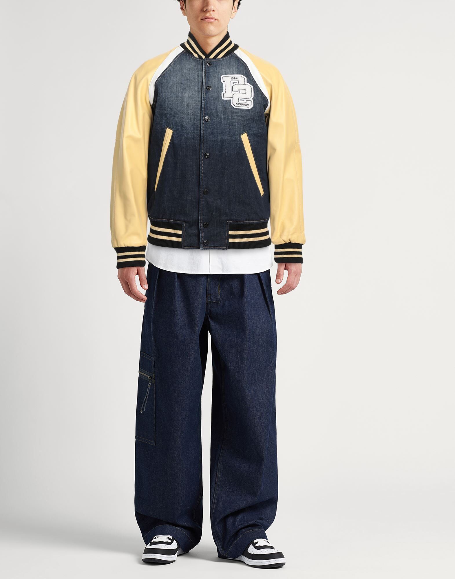 Джинсовая куртка-бомбер, деним, кожа, разноцветный, логотип бренда, темная стирка, круглый вырез горловины, длинные рукава, полностью на подкладке, застежки-кнопки, множество карманов, содержит нетекстильные части животного происхождения, сухая чистка, не отбеливать, не сушить в стиральной машине
