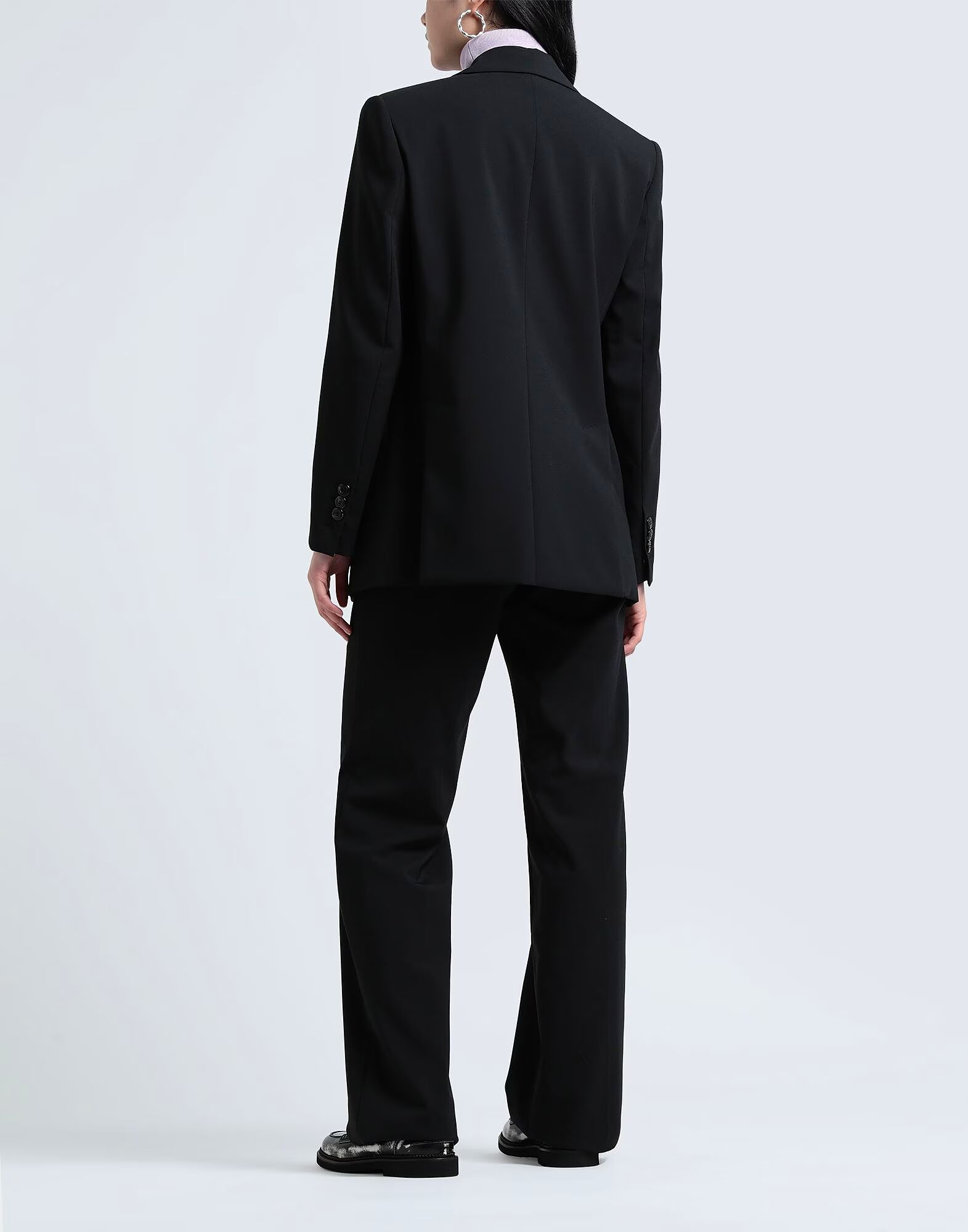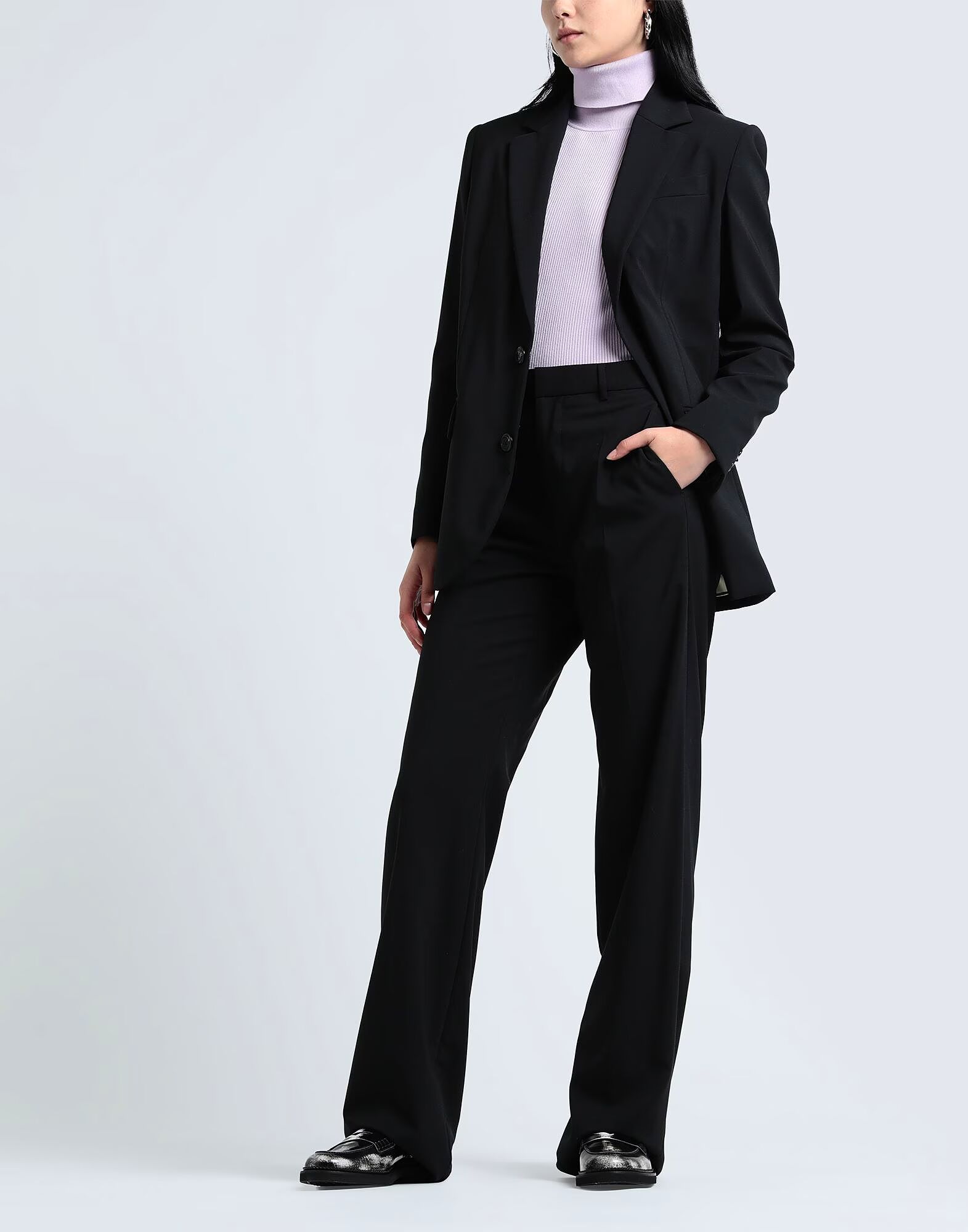 Полотняное переплетение, без аппликаций, однотонный цвет, воротник с лацканами, однобортный, длинные рукава, полностью на подкладке, застежка на пуговицы, множество карманов, высокая талия, эластичный, модель брюк