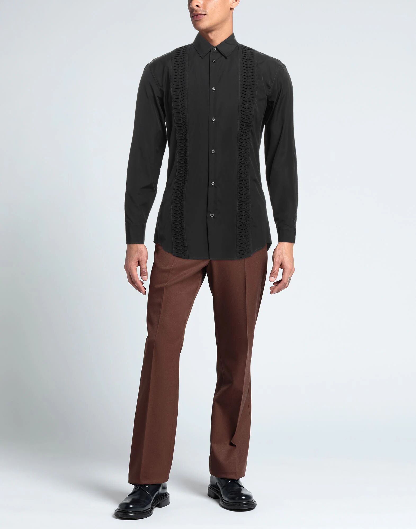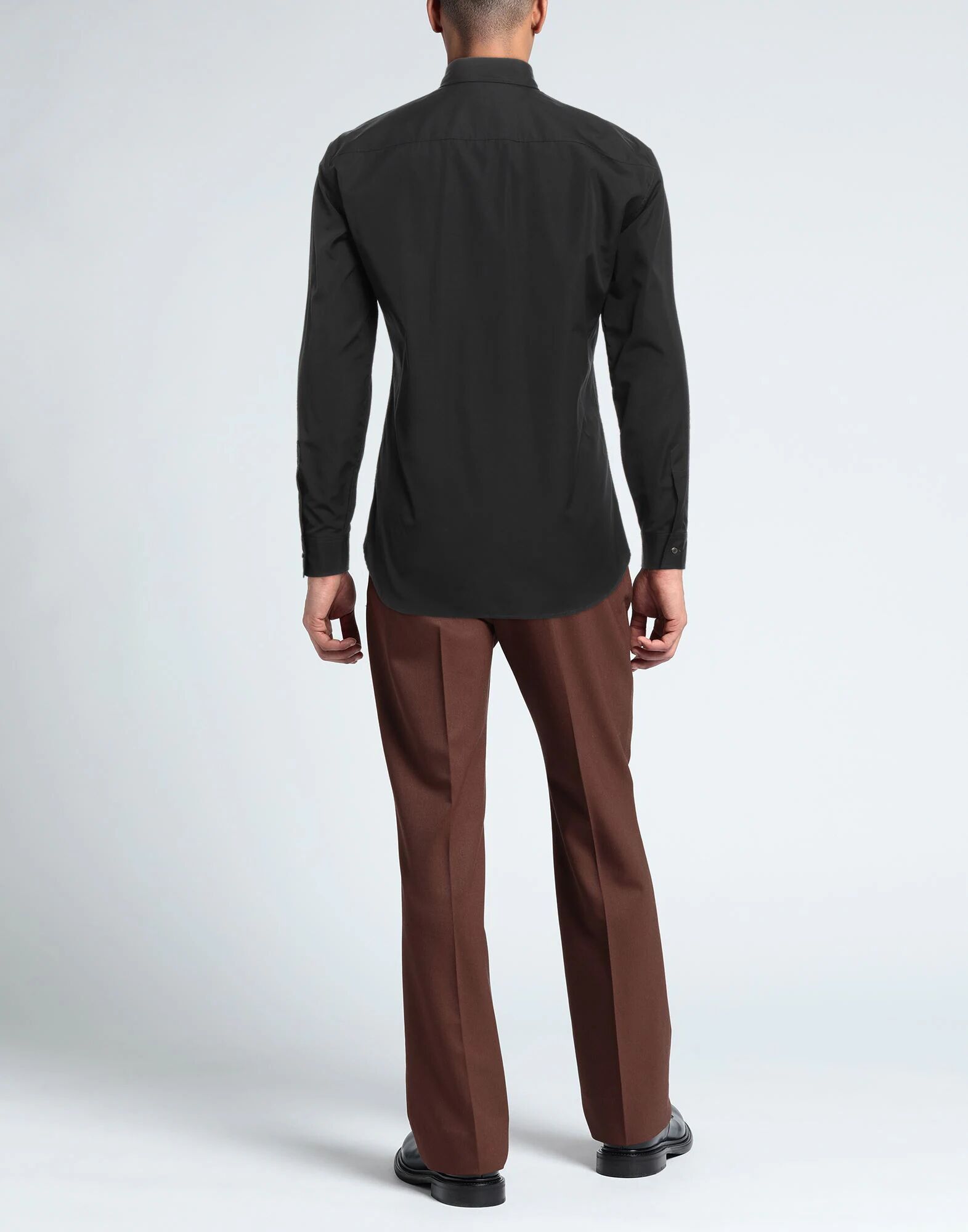 Полотняное переплетение, без аппликаций, однотонный цвет, классический вырез горловины, длинные рукава, застежка на пуговицы, без карманов