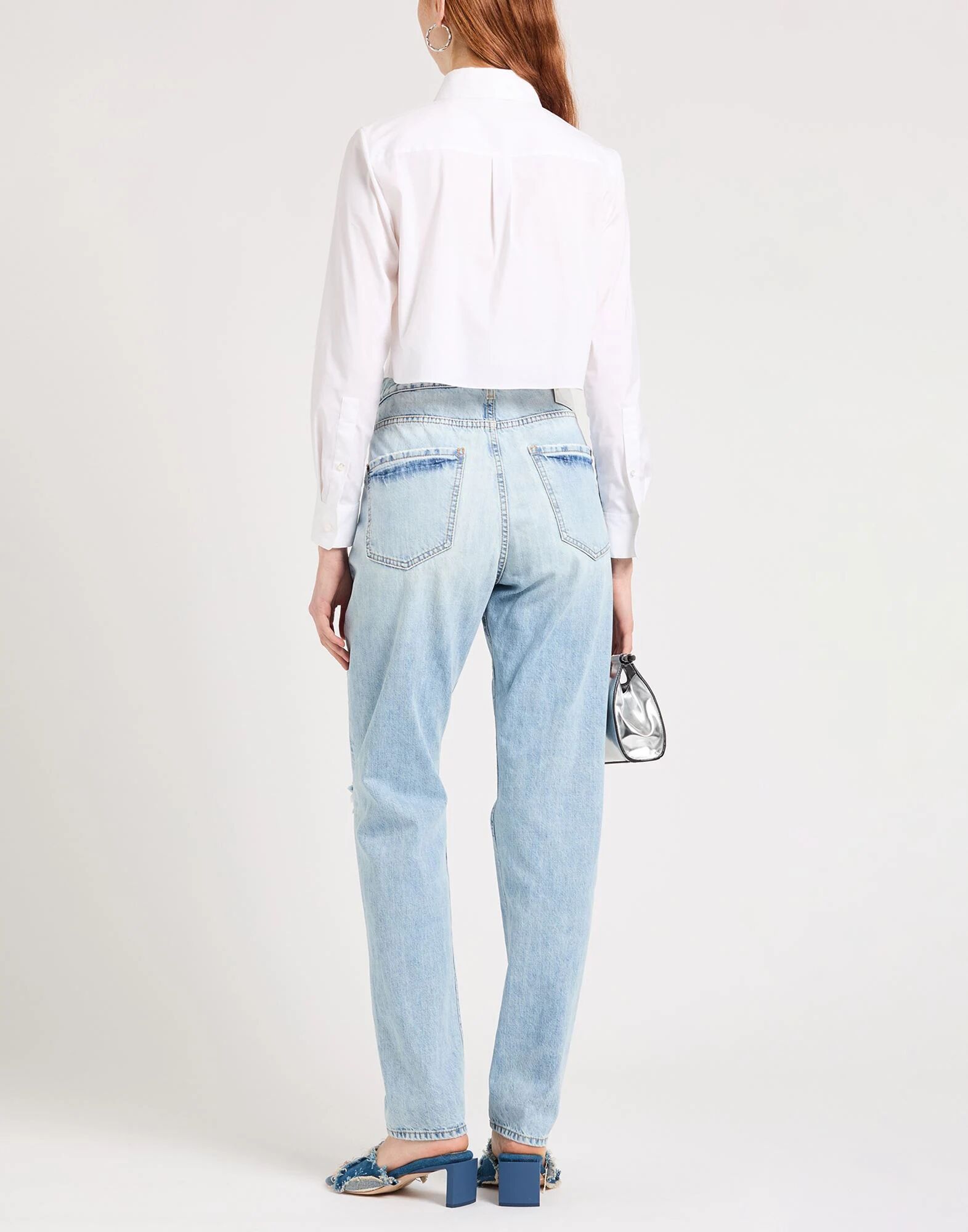 Джинсы-бойфренды, деним, потертые, выцветшие, однотонные, логотип бренда, легкая стирка, высокая талия, классический крой, застежка на пуговицы, множество карманов, машинная стирка или химчистка, не отбеливать, нельзя сушить в стиральной машине, содержит нетекстильные части животного происхождения