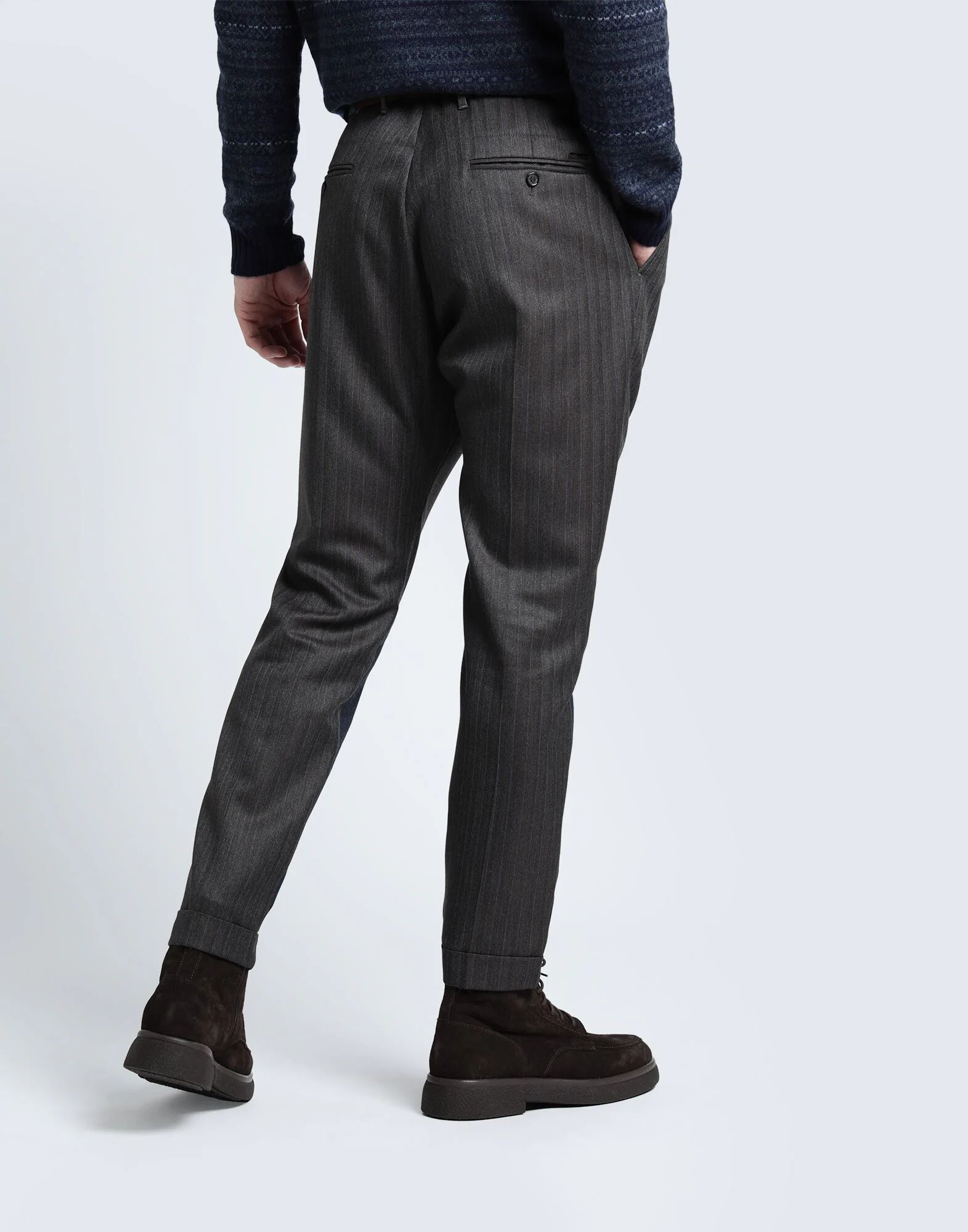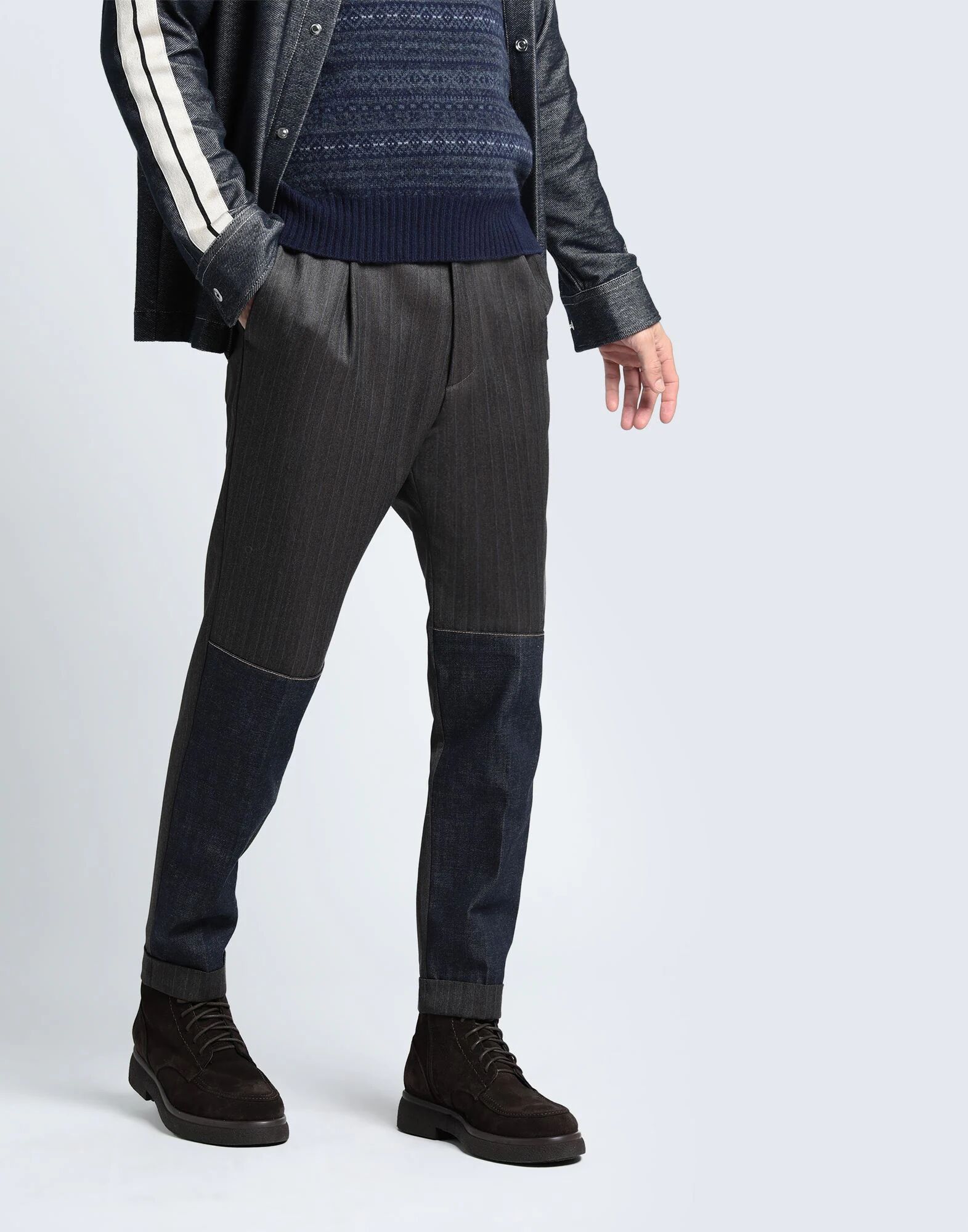 Деним, прохладная шерсть, логотип бренда, в тонкую полоску, высокая талия, зауженные штанины, классический крой, застежка на крючки и петли, застежка на молнию, множество карманов, содержит нетекстильные части животного происхождения