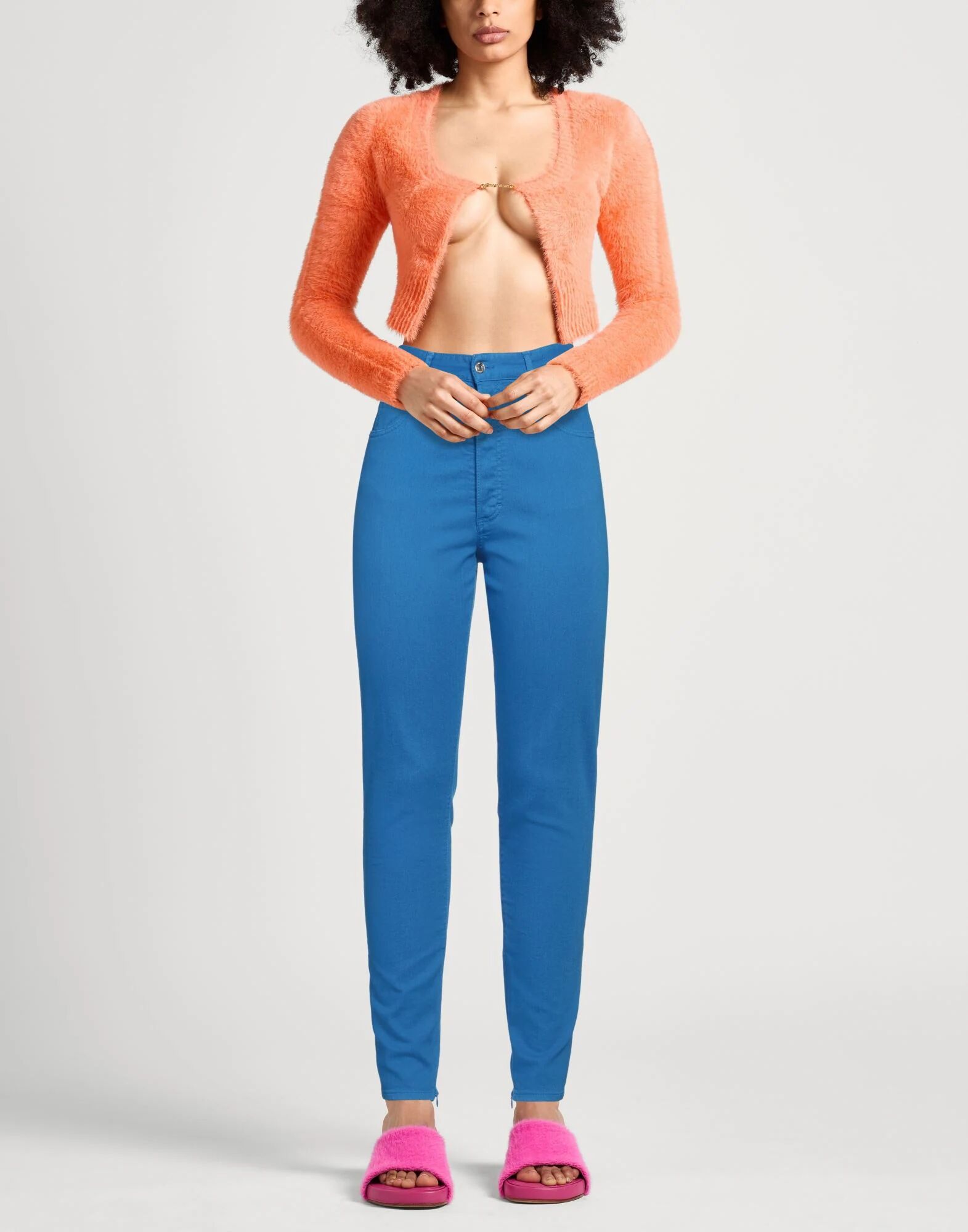 Деним, логотип бренда, однотонный, цветная стирка, высокая талия, шлевки для ремня, зауженные штанины, узкие брюки, застежка на пуговицы, молнии на подоле, эластичный, машинная стирка, не сушить в стиральной машине, не отбеливать, содержит нетекстильные части животного происхождения, обтягивающая модель
