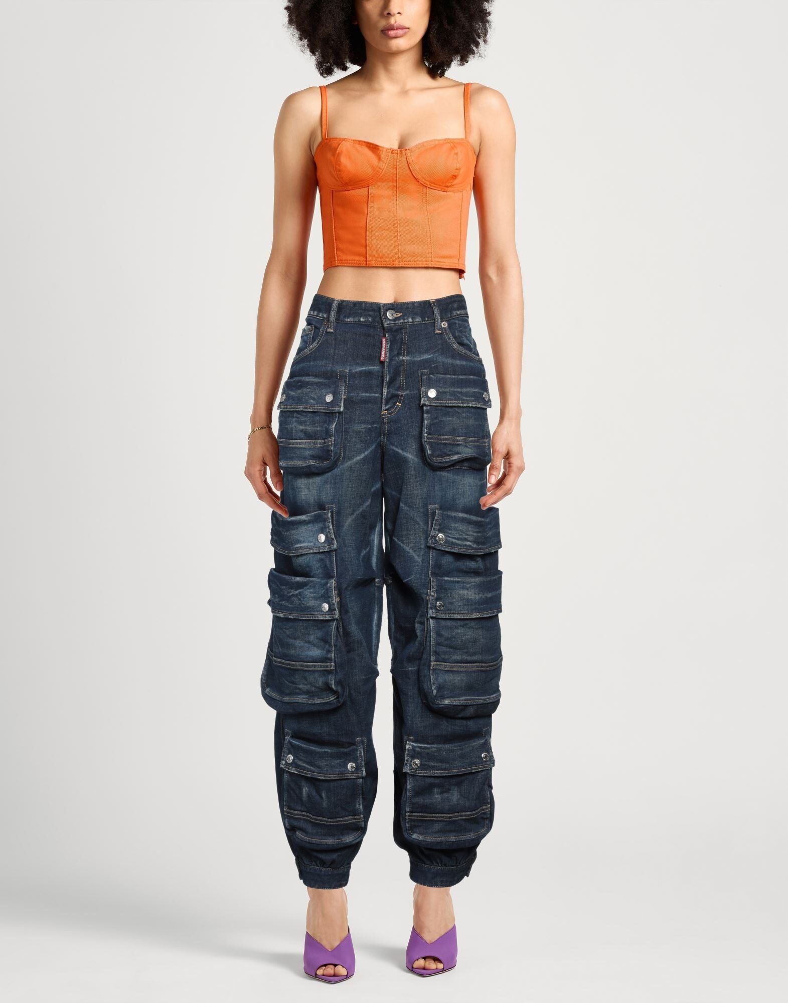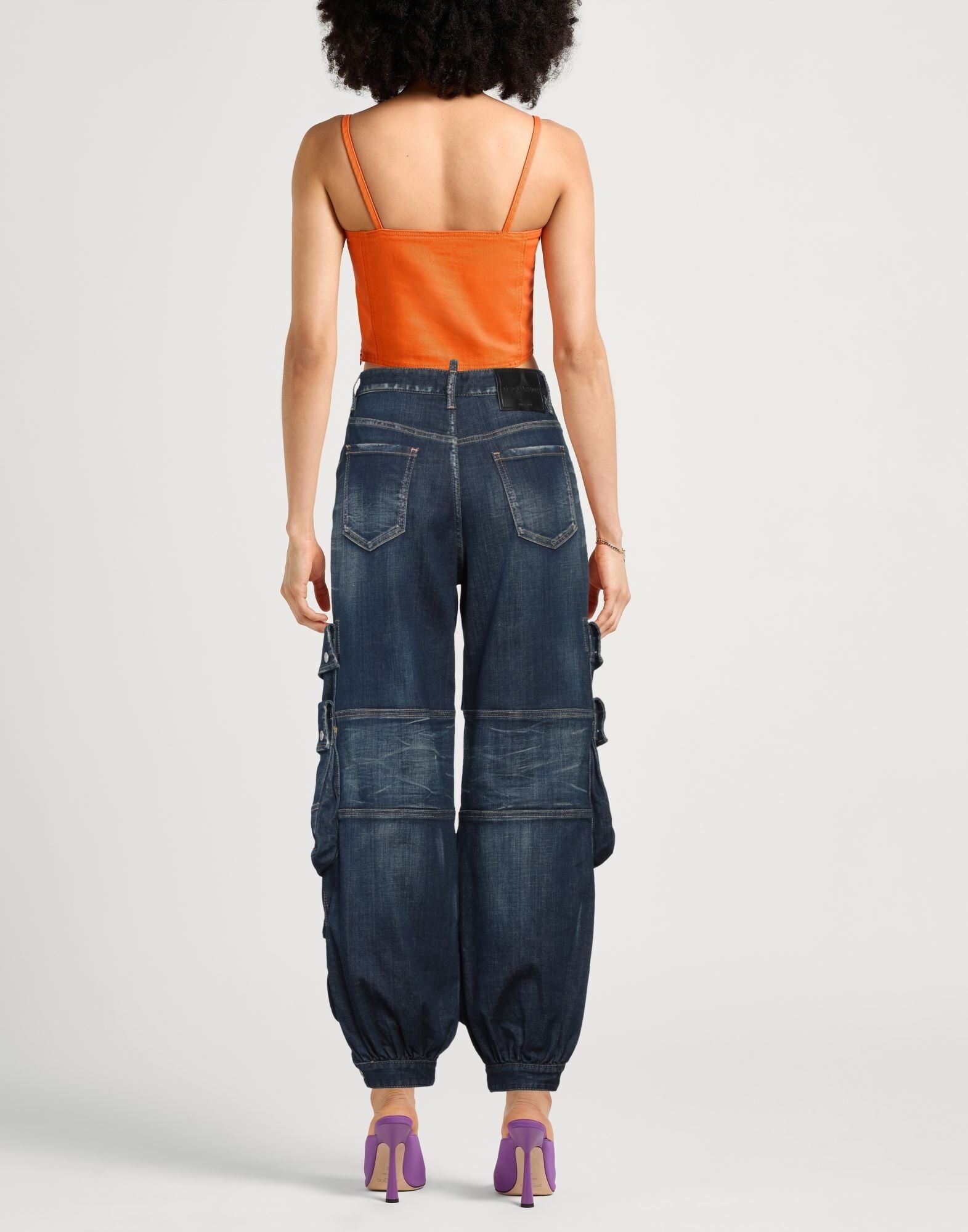 Джинсы-карго, деним, выцветшие, однотонные, логотип бренда, кожаные вставки, темная стирка, низкий шаговый шов, свободный крой, застежка на пуговицы, множество карманов, эластичные, машинная стирка, не отбеливать, нельзя сушить в стиральной машине, содержит нетекстильные части животного происхождения
