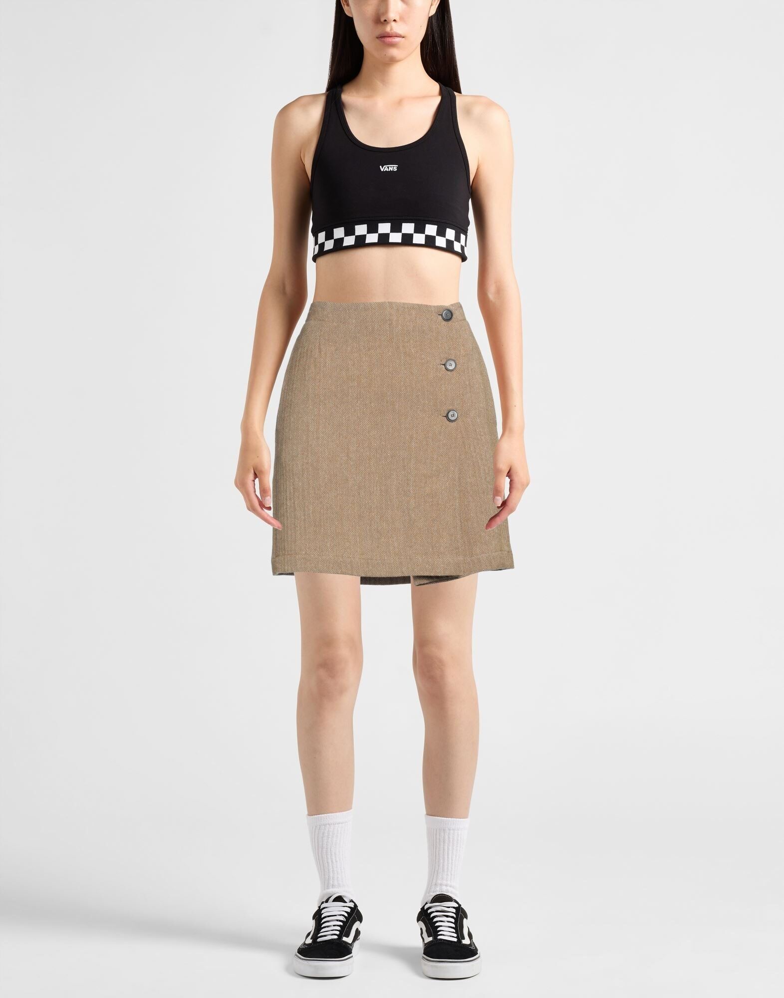 Расклешенная юбка, твид, узор «ёлочка», эффект запаха, полностью на подкладке, застежка на пуговицы, множество карманов, ручная стирка или химчистка, не отбеливать, не сушить в стиральной машине
