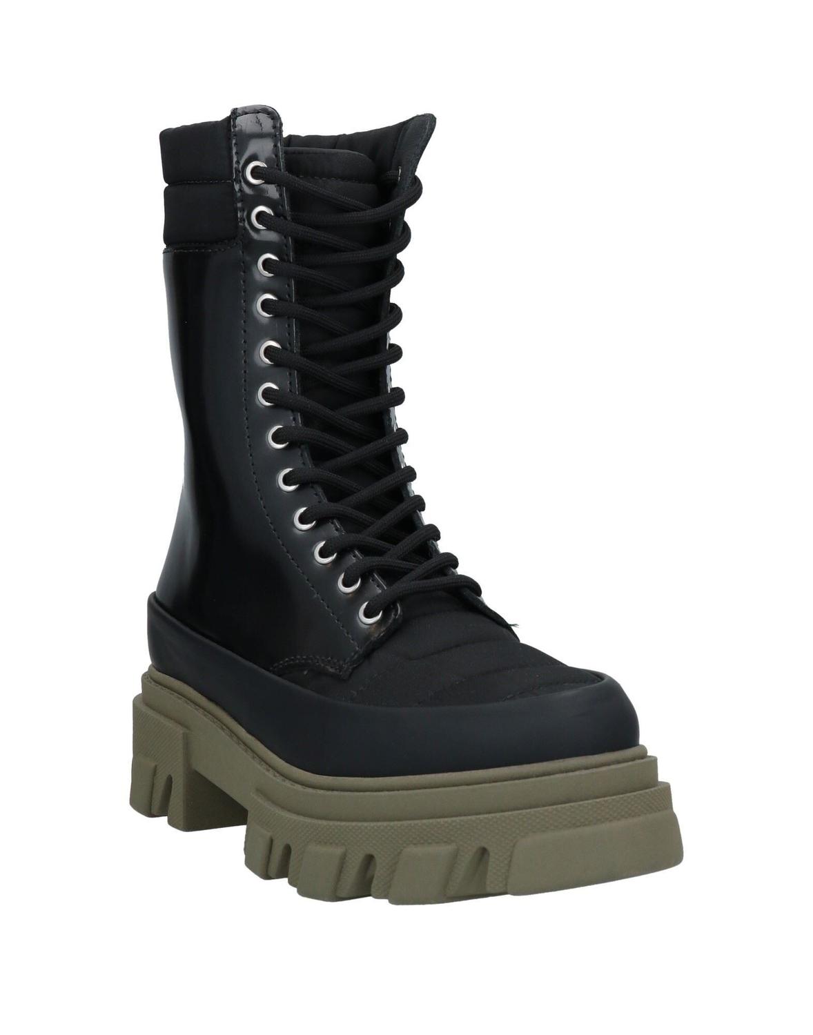 Техническая ткань, кожа, полированная кожа, логотип бренда, однотонный цвет, внутренняя подкладка, шнурки, скругленный носок, квадратный каблук, резиновая подошва с рифлением, содержит нетекстильные части животного происхождения, маленькие размеры, массивные ботинки