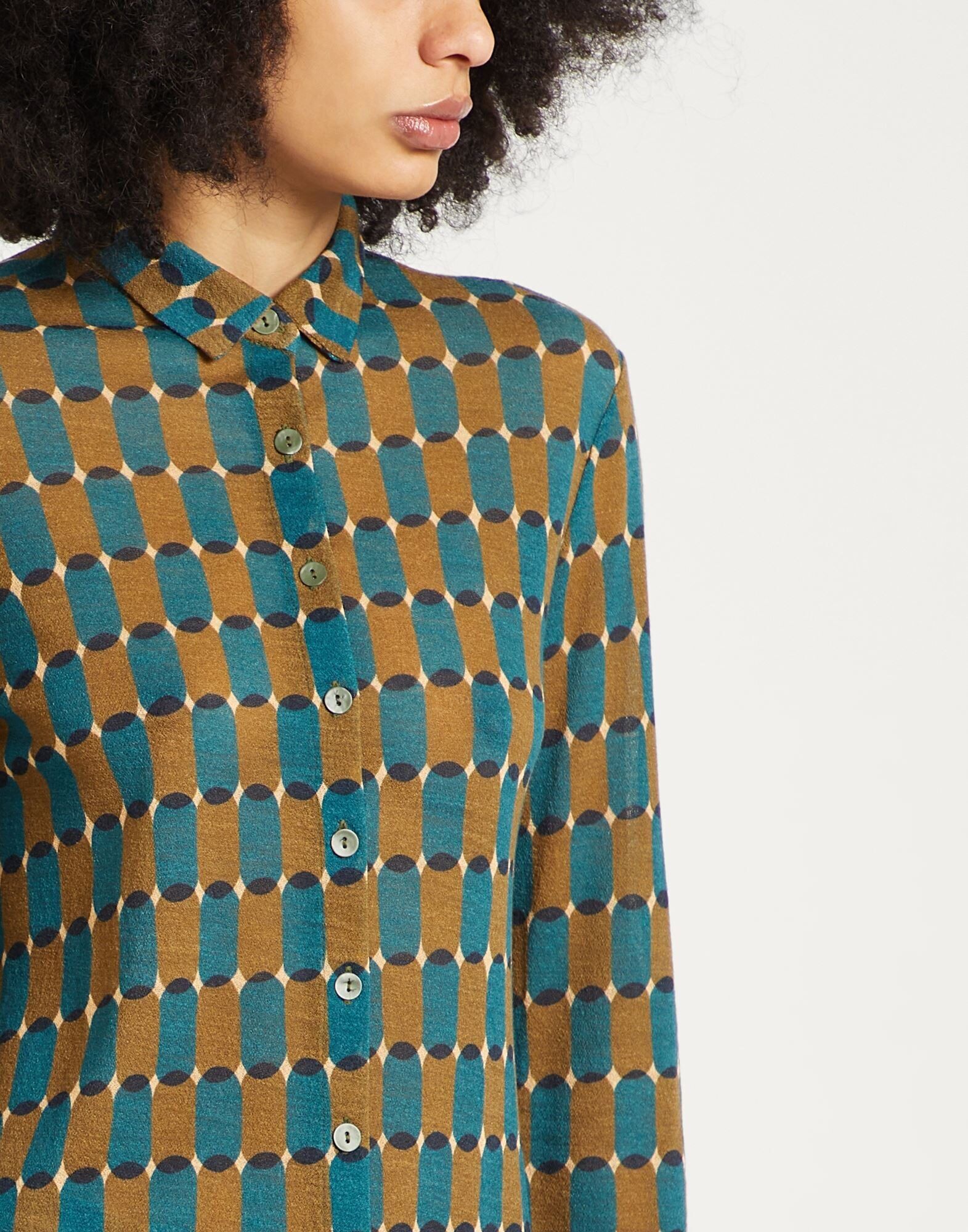 Трикотаж, легкий трикотаж, без аппликаций, геометрический принт, классический воротник, длинные рукава, застежка на пуговицы, без карманов, ручная стирка или химчистка, не сушить в стиральной машине, не отбеливать, рубашка