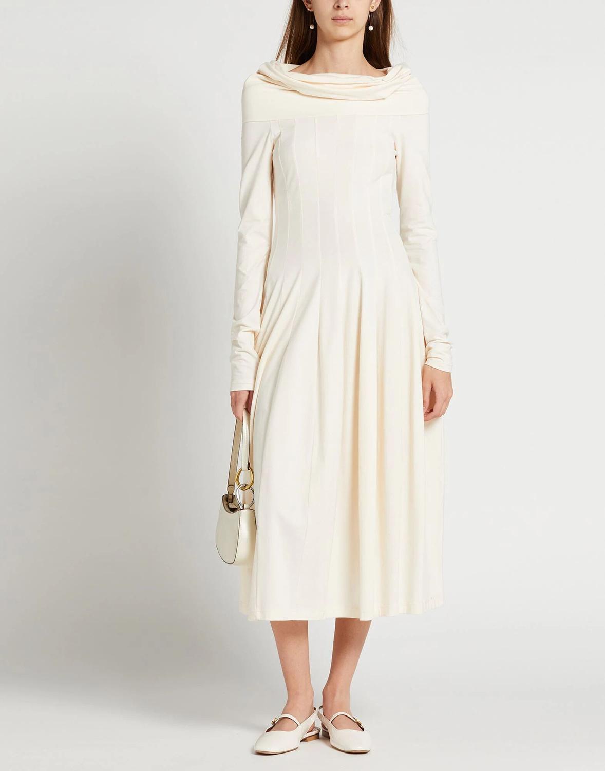 Джерси, без аппликаций, однотонный, вырез горловины «лодочка», длинные рукава, без подкладки, без карманов, эластичный, ручная стирка или химчистка, не отбеливать, нельзя сушить в стиральной машине, расклешенное платье