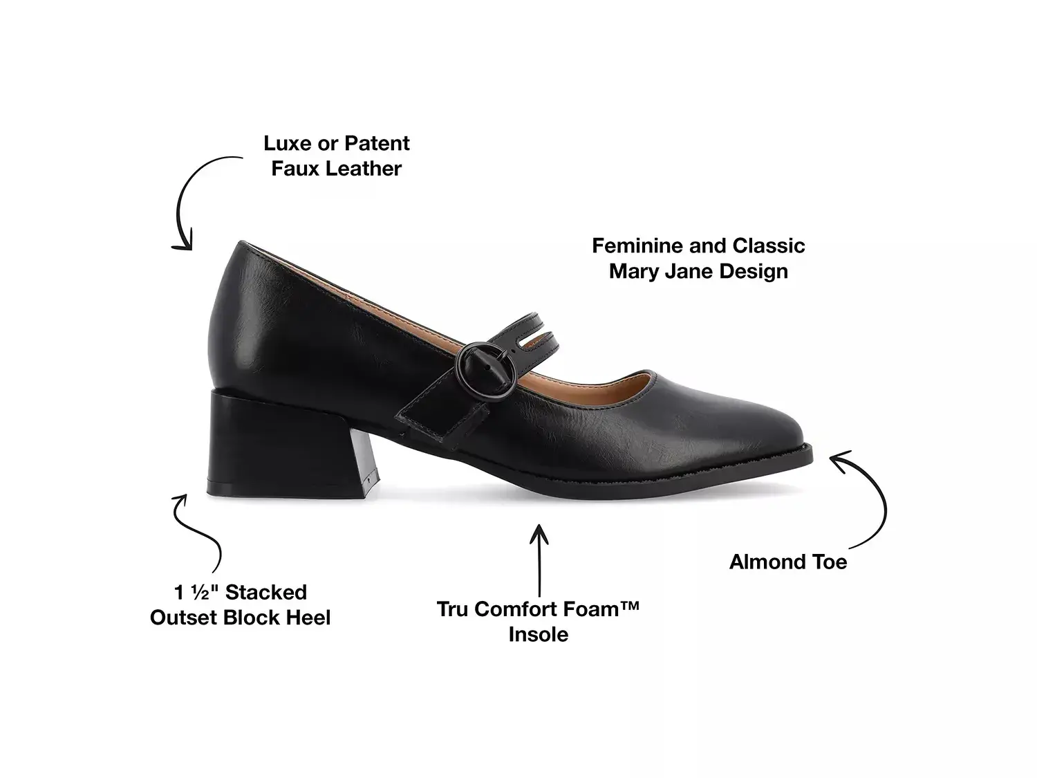 Будьте главной аттракцией на любом мероприятии с туфлями Savvi из коллекции Journee. Обладая профилем в стиле Мэри Джейн, эта туфля с миндалевидным носом излучает старомодную элегантность. Лаковый блеск и сложенный блокированный каблук создают шикарный образ, в то время как пена Tru Comfort заботится о вашем комфорте.
