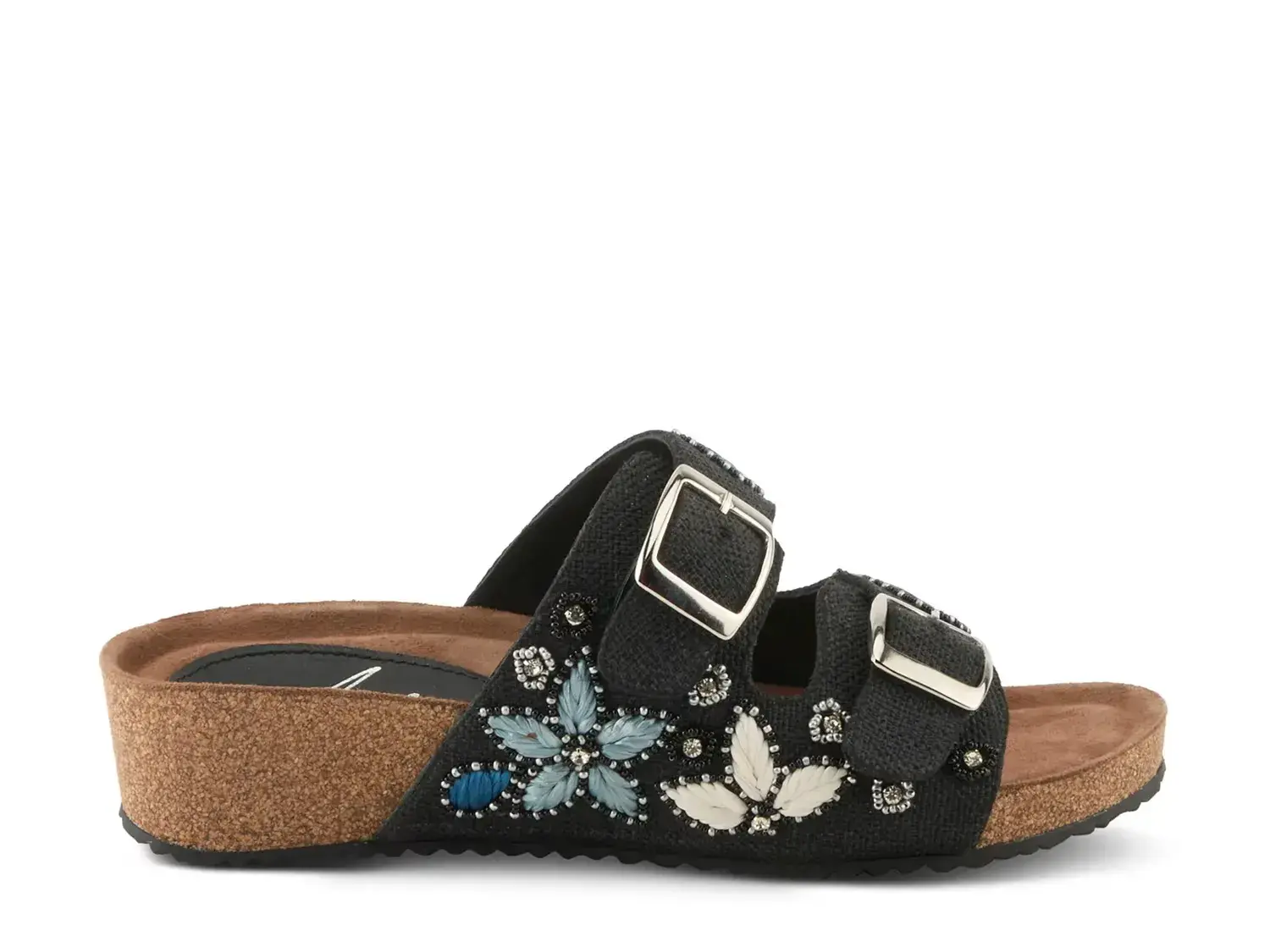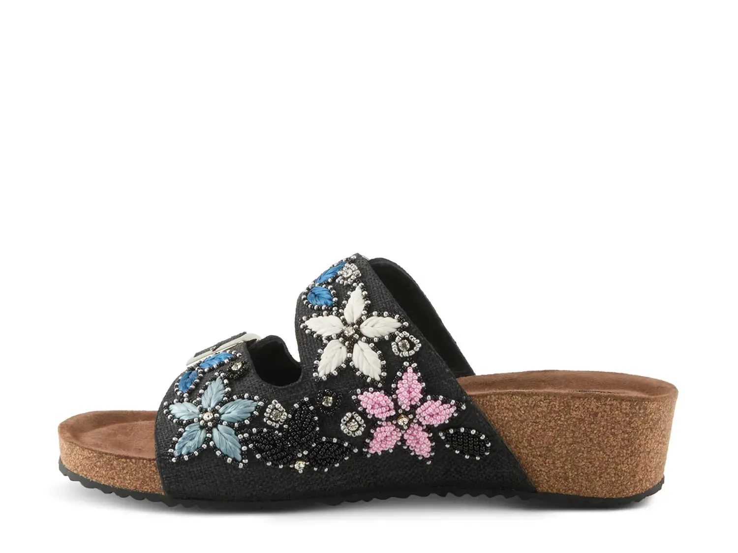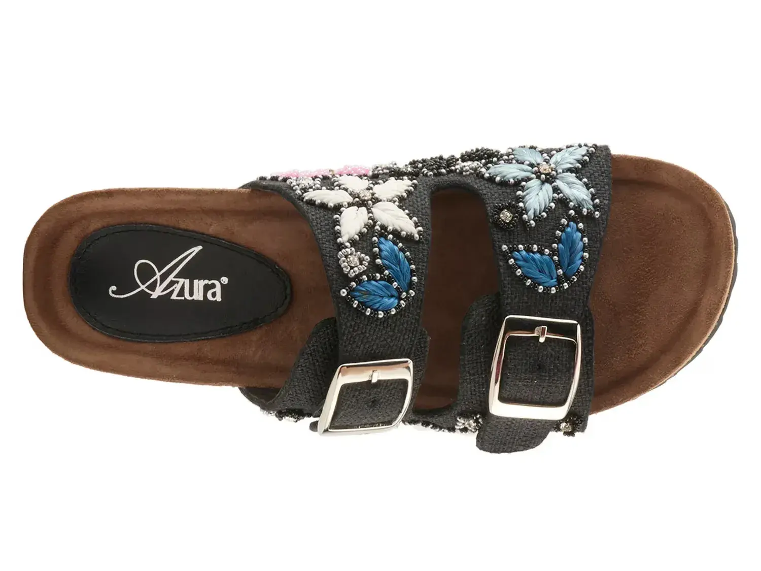 Дополните свой летний гардероб цветочным акцентом. Деревянные сандалии на платформе Miraflores от Azura имеют классический двойной ремешок, украшенный бусинами и элегантными стразами.