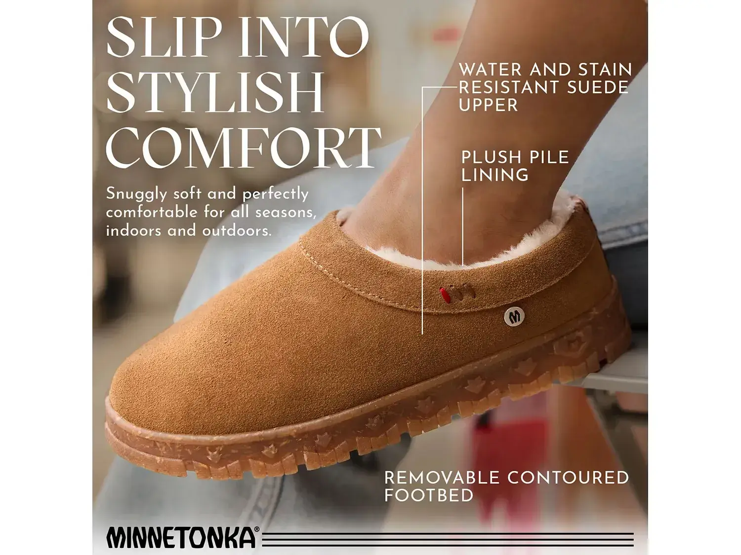 Оставайтесь в тепле весь день с сабо Neva от Minnetonka. Верх из водо- и грязеотталкивающего замши сохраняет этот шлепанец стильным и чистым. Контурная стелька, пушистая подкладка и сильно протекторная подошва поднимают уровень комфорта на новую высоту. Яркий дизайн веб-ленты на пятке подчеркивает общий стиль.