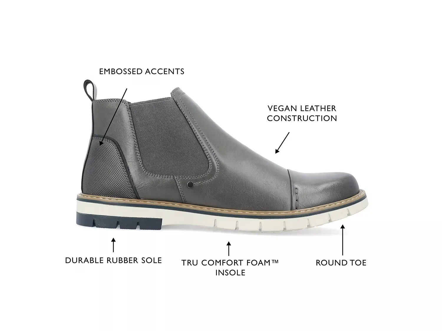Сделайте стильное заявление с помощью ботинок челси Waylon от Vance Co. Этот веганский синтетический ботинок разработан с боковыми вставками и задним язычком для удобного надевания и снятия. Стелька Tru Comfort Foam массирует ваши ноги комфортом, в то время как контрастная резиновая подошва обеспечивает хорошую поддержку.