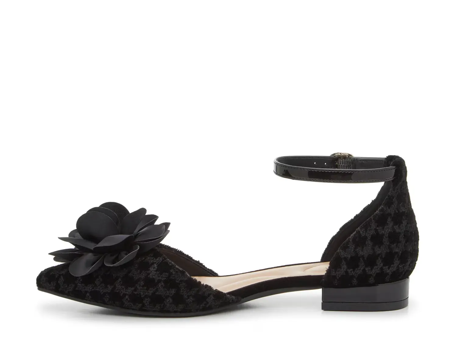 Поднимите свой образ с помощью цветочной силы! Балетки Obelia от Kelly & Katie добавляют веселый штрих к любому look благодаря стильному остроносому дизайну, изящному ремешку на лодыжке и цветочному акценту. Завершены элегантным узором "гусиные лапки", тисненным на велюре.