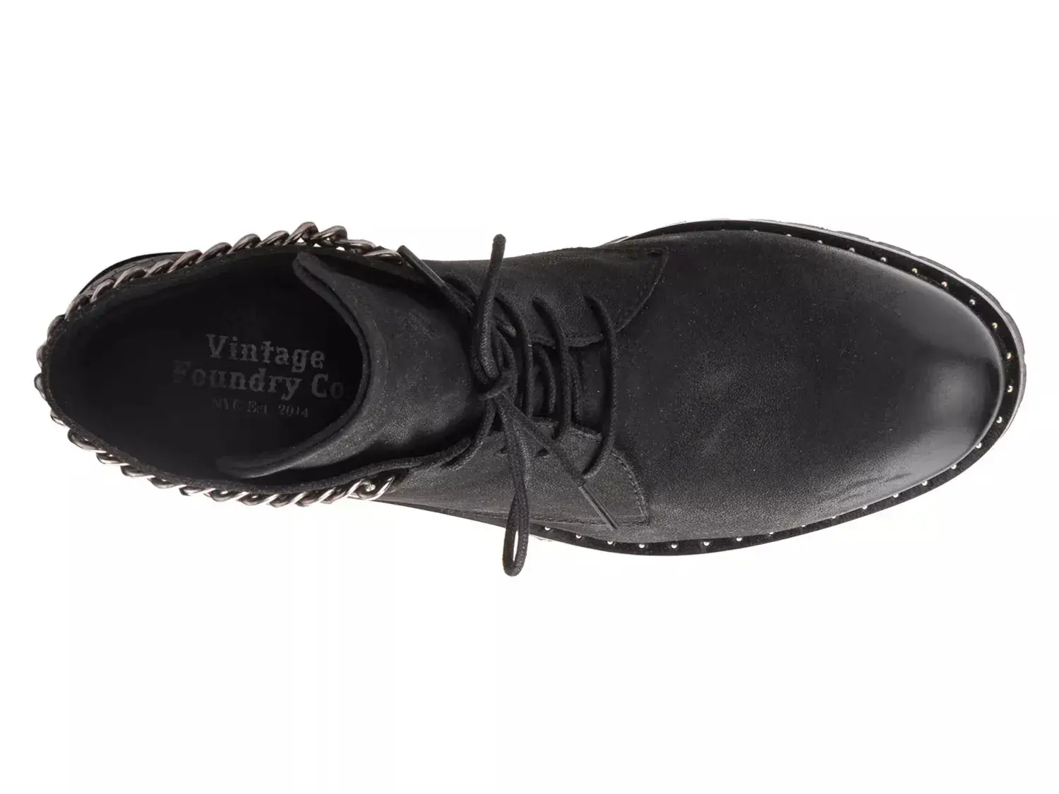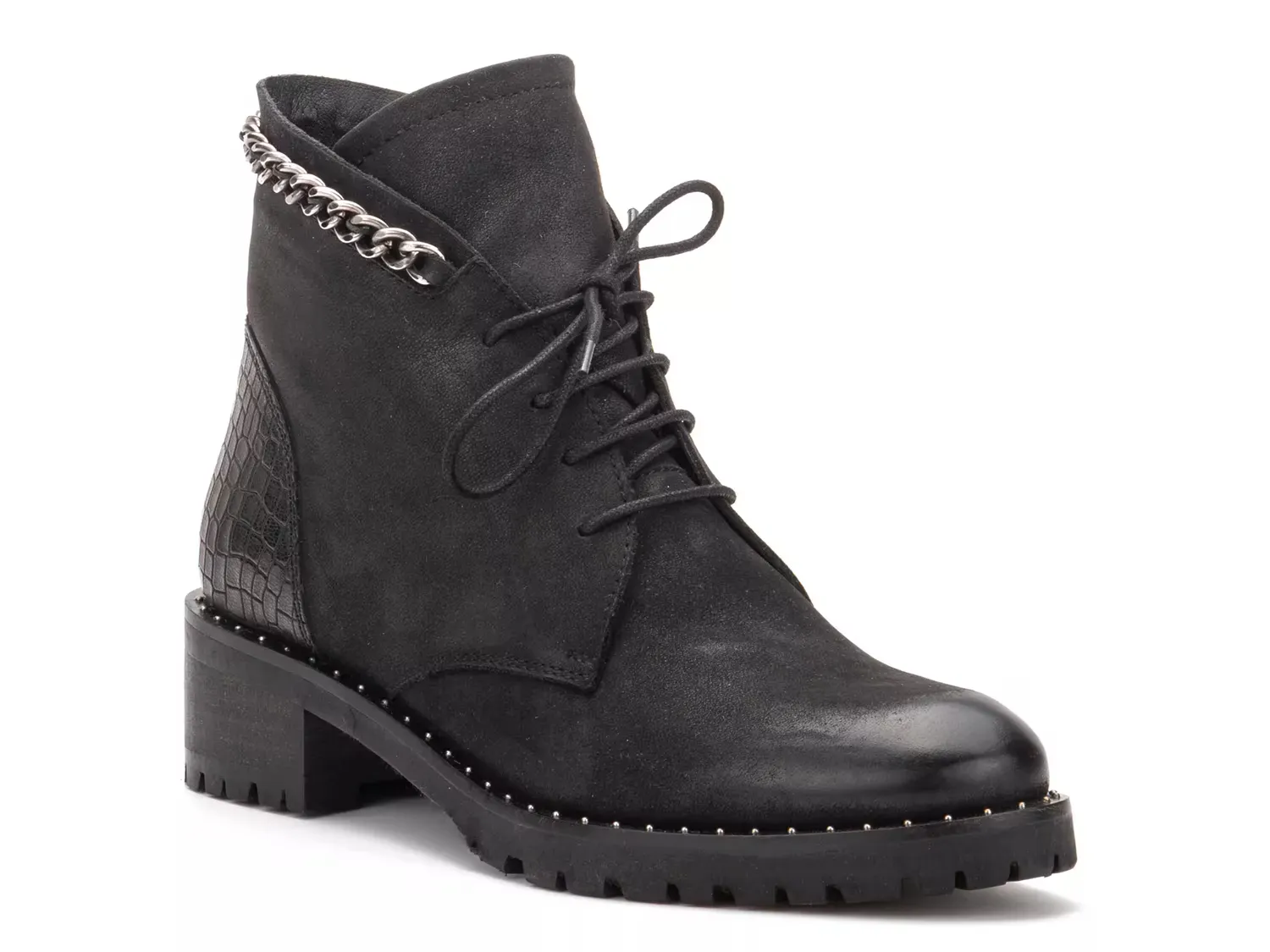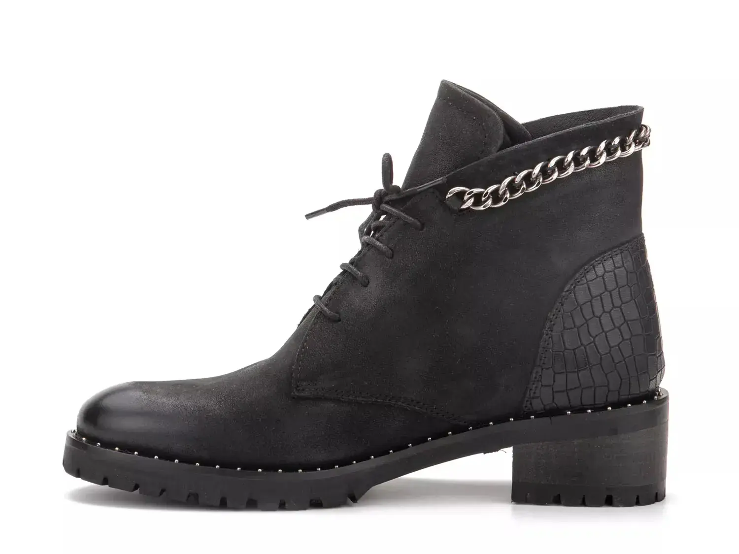Классические ботинки на шнуровке получают современное обновление с моделью Ольга от Vintage Foundry Co. Эти ботинки до щиколотки украшены цепочкой вдоль верхнего края, стеганой промежуточной подошвой и каблуком с крокодиловым рисунком для дополнительного стиля.