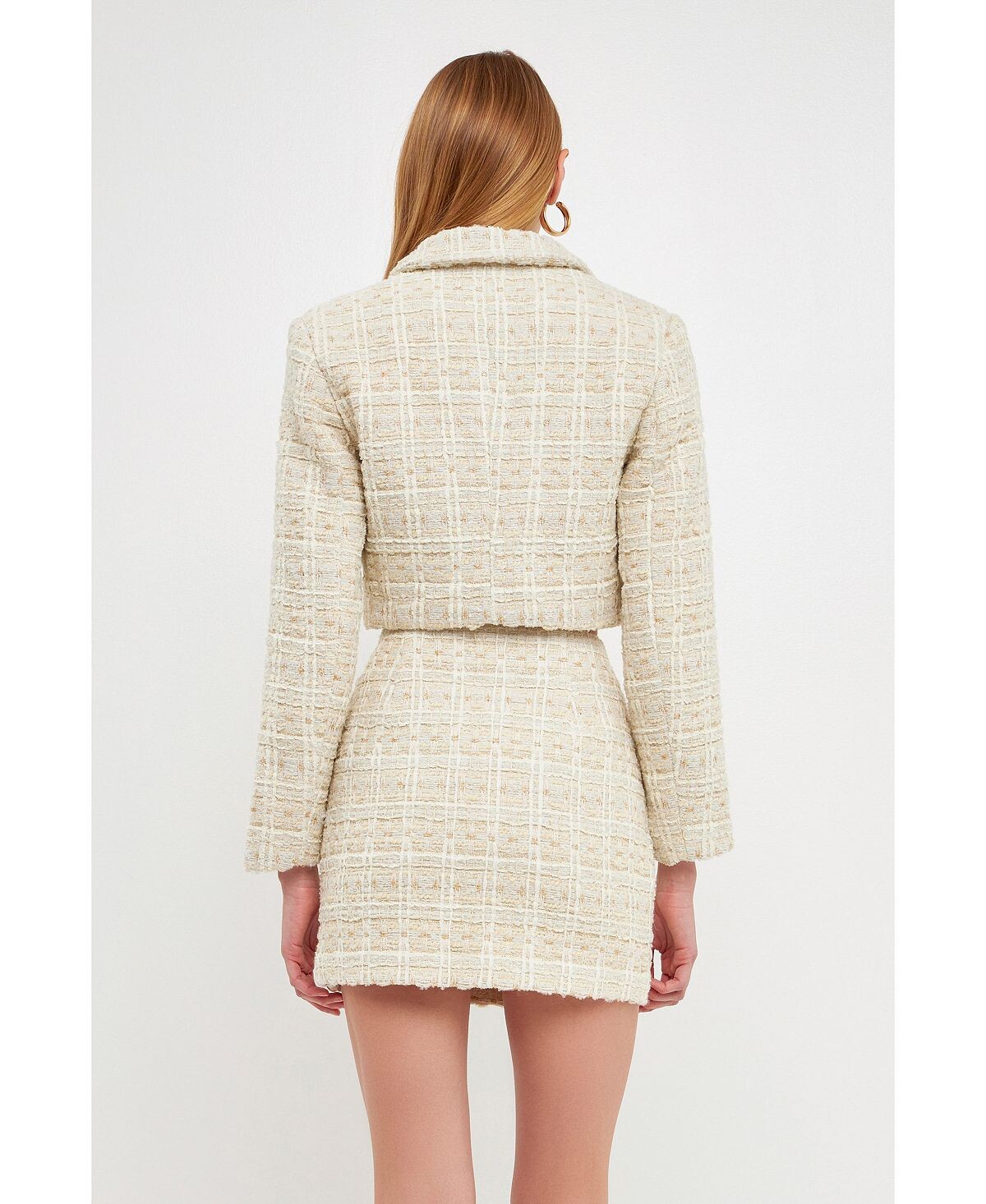 Этот укороченный жакет выполнен из высококачественного твида и украшен детальными золотыми пуговицами. Кроме того, подплечники придают изделию структурированный элемент, поэтому оно красиво лежит на вас.
