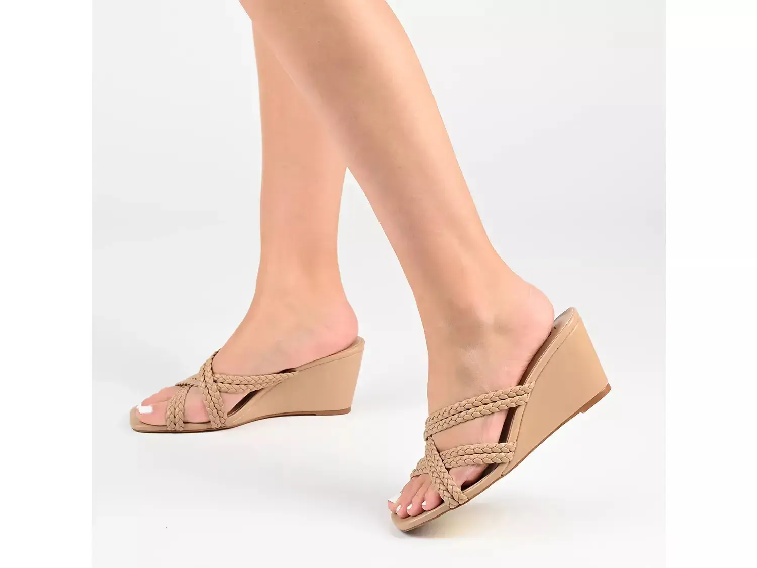 Никогда не упустите коллекцию Journee с сандалиями на танкетке Baylen, которые идеально подходят как для повседневной, так и для вечерней одежды. Плетёные перекрещенные ремешки подчеркивают женственный шик этого сандалия на слипе, элегантно приподнятого на прочном каблуке-танкетке.