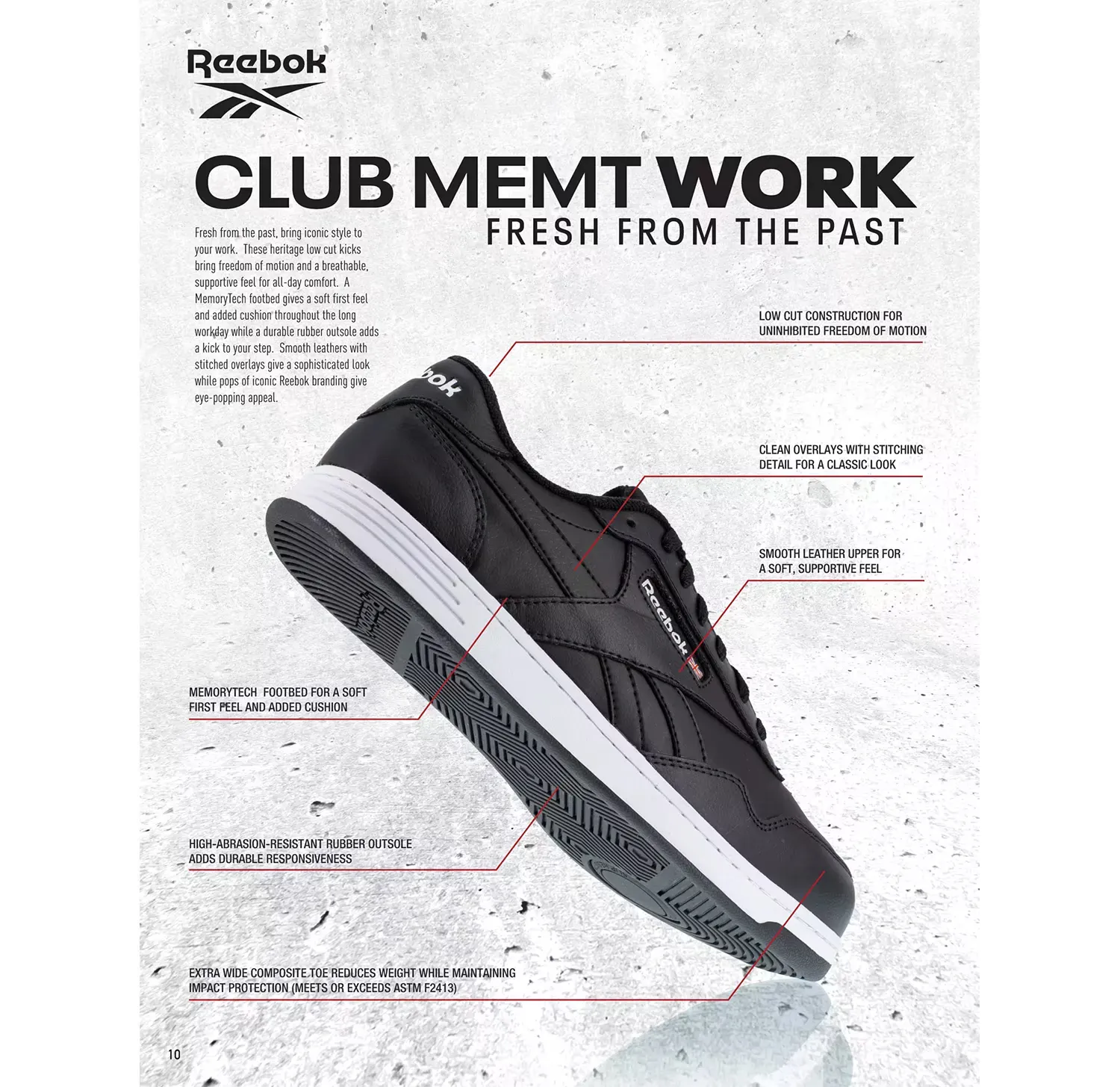 Получите максимум от своих рабочих дней в кроссовках Club MEMT от Reebok Work. Эта пара с EH-рейтом оснащена композитным носком, подошвой из высокоабразивной резины и стелькой Memory Tech, что обеспечивает полноценную и поддерживающую посадку.