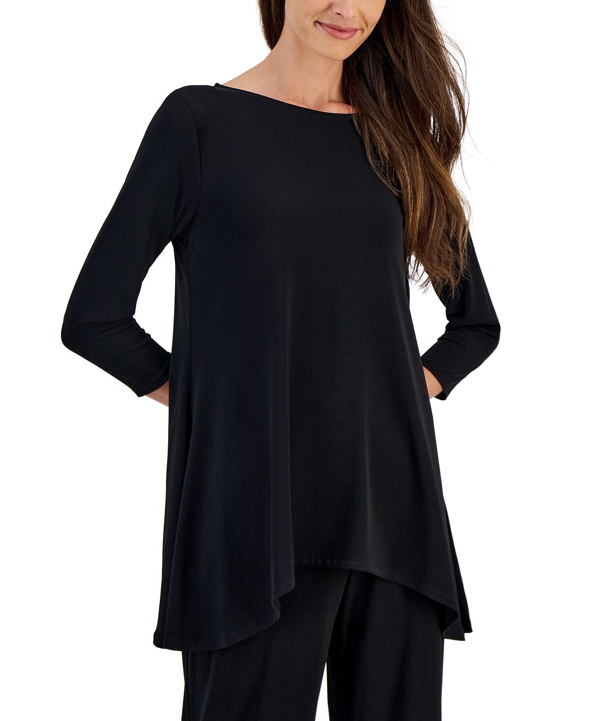 Добавьте яркий шарф, крупные бусы или тонкую оперную нить. Этот сдержанный вязаный топ из коллекции JM — идеальное начало для бесконечных образов.