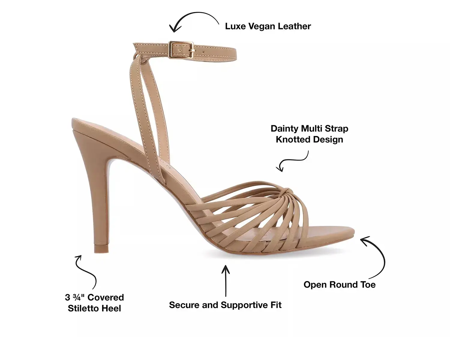 Покажите свой изысканный стиль, надев сандалии Vanita от коллекции Journee. Тонкие многостраничные ремешки с узелковым украшением и застежкой на щиколотке оформляют эту сандалию на шпильке. Удобная стелька обеспечивает комфорт для любых занятий, которые могут ожидать вас в течение дня.