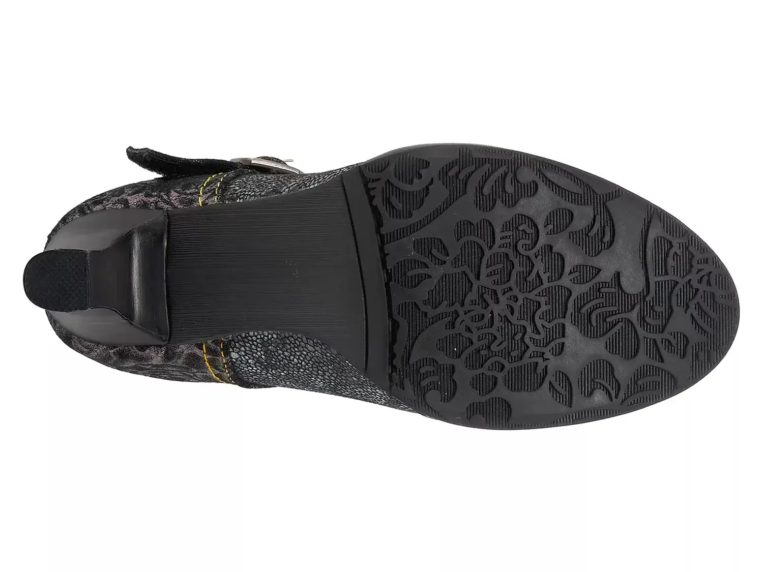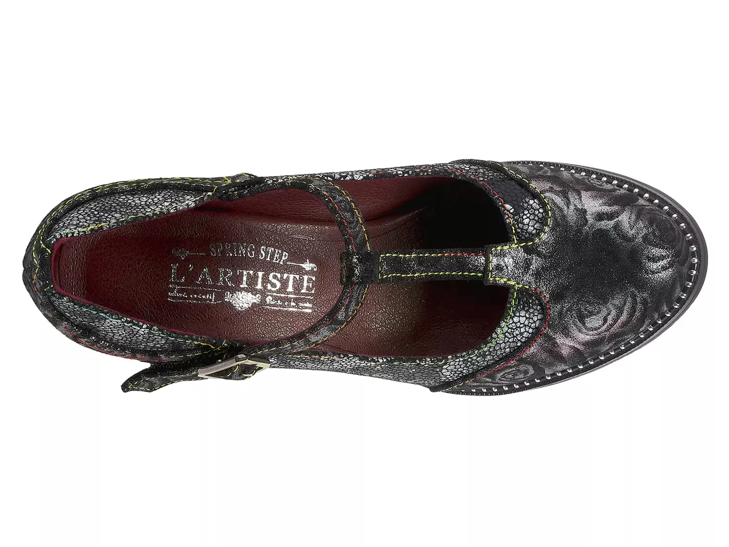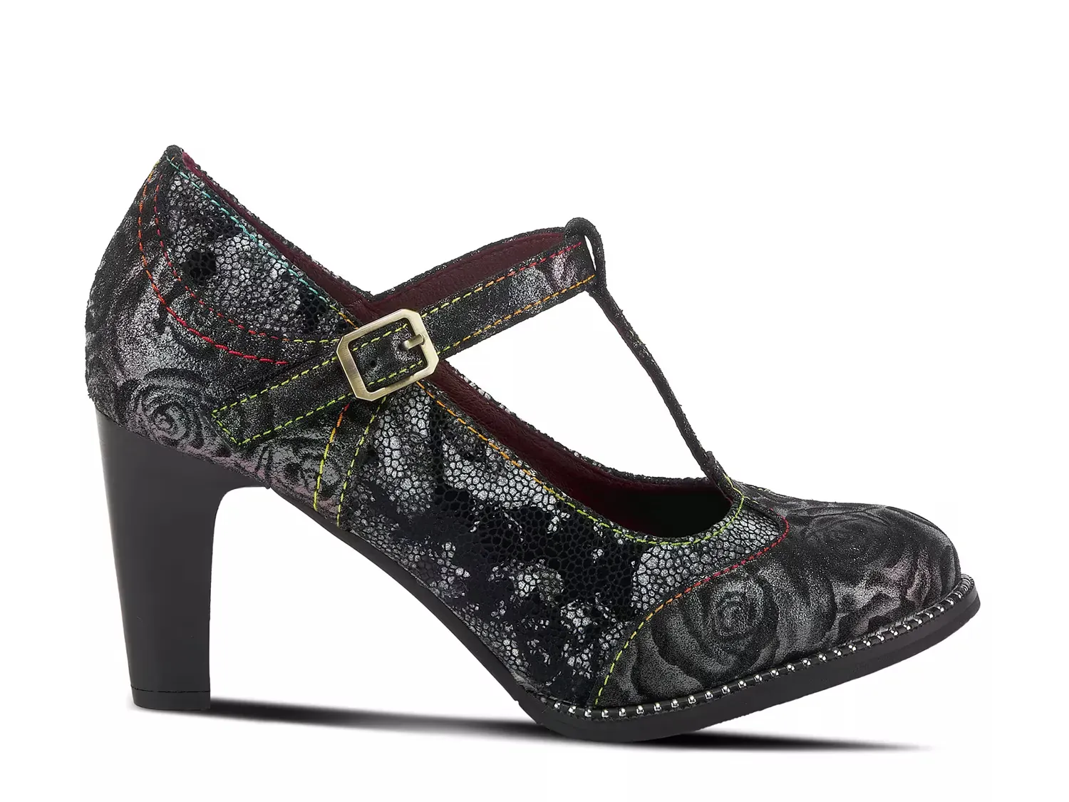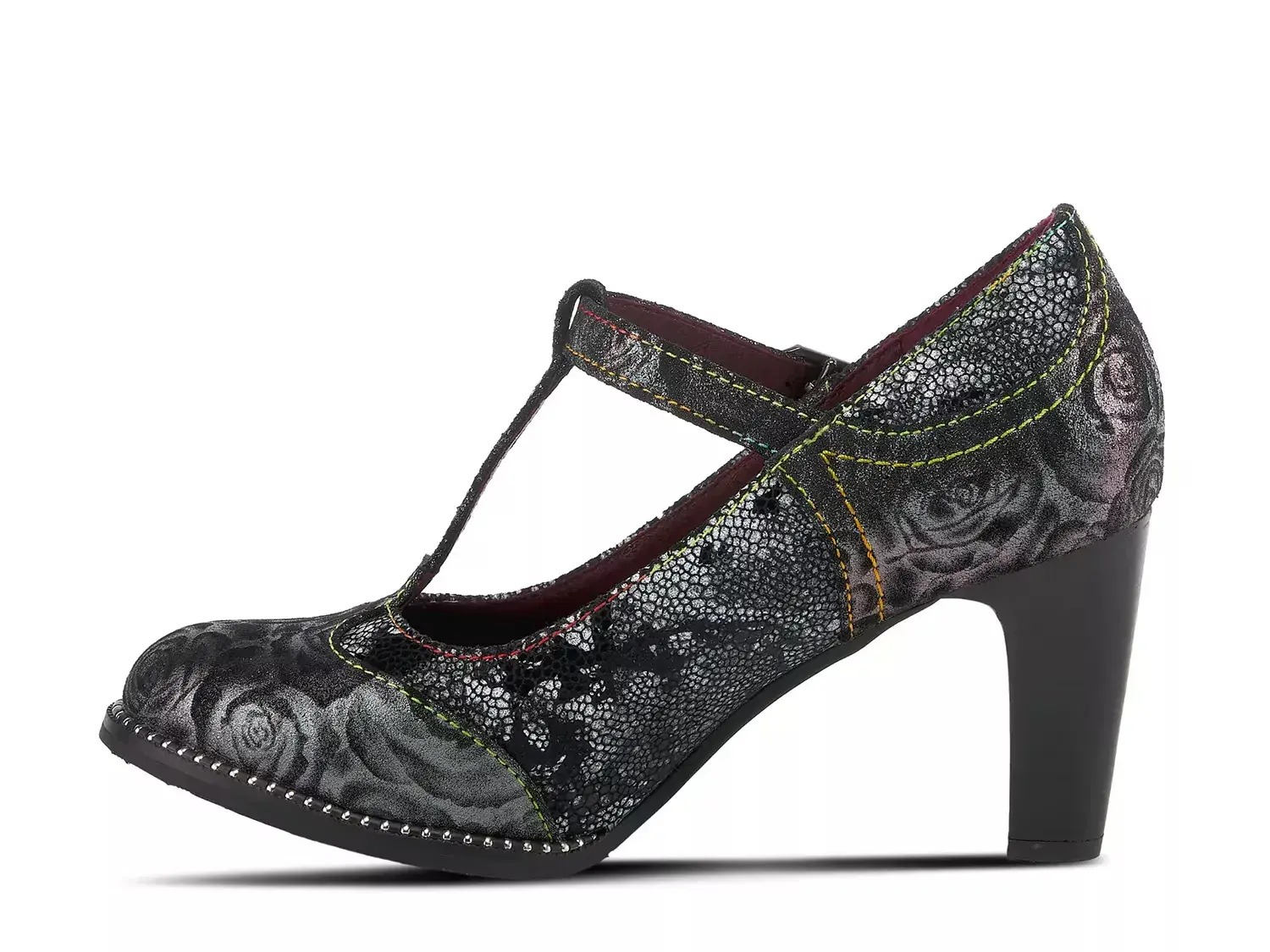 Тщательно проработанный с двухтонкой текстурированной цветочной металлической печатью и блестящим мозаичным узором, туфля L'Artiste Mazie является идеальным сочетанием современного изящества и элегантности. Эта туфля оснащена ремешком в форме буквы T с застежкой на липучке и блестящим ободком, вдохновлённым браслетом, чтобы подчеркнуть её внешний вид.