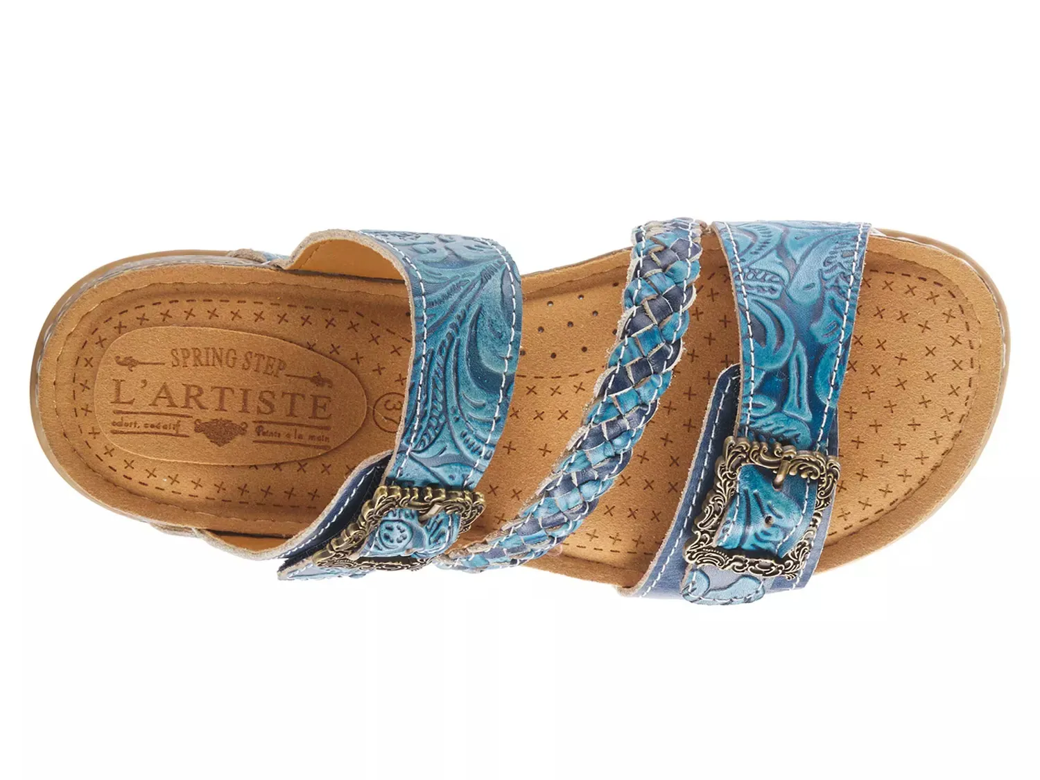 Искусство и мода гармонично сочетаются в платформенных сандалиях L'Artiste Astra. Антикварная рифленая пряжка и асимметрично заплетенная средняя лямка поднимают модный статус этих ручной росписи сандалий.