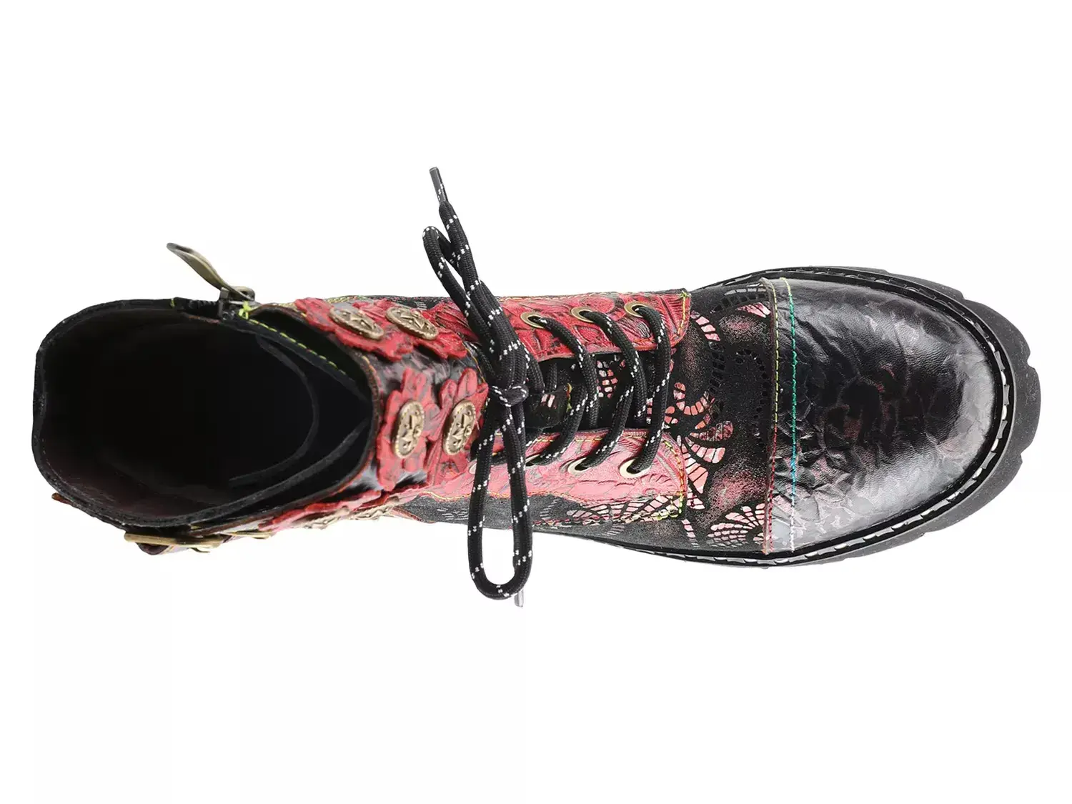 Ботильоны Limitless от L'Artiste тщательно детализированы цветочными вырезами, ручной росписью из натуральной кожи с tanning и металлическими заклепками для традиционного стиля. С внутренней молнией, шнуровкой и пряжками, эти ботильоны предлагают идеальную посадку, в то время как искусственная меховая стелька обеспечивает непревзойденный комфорт.