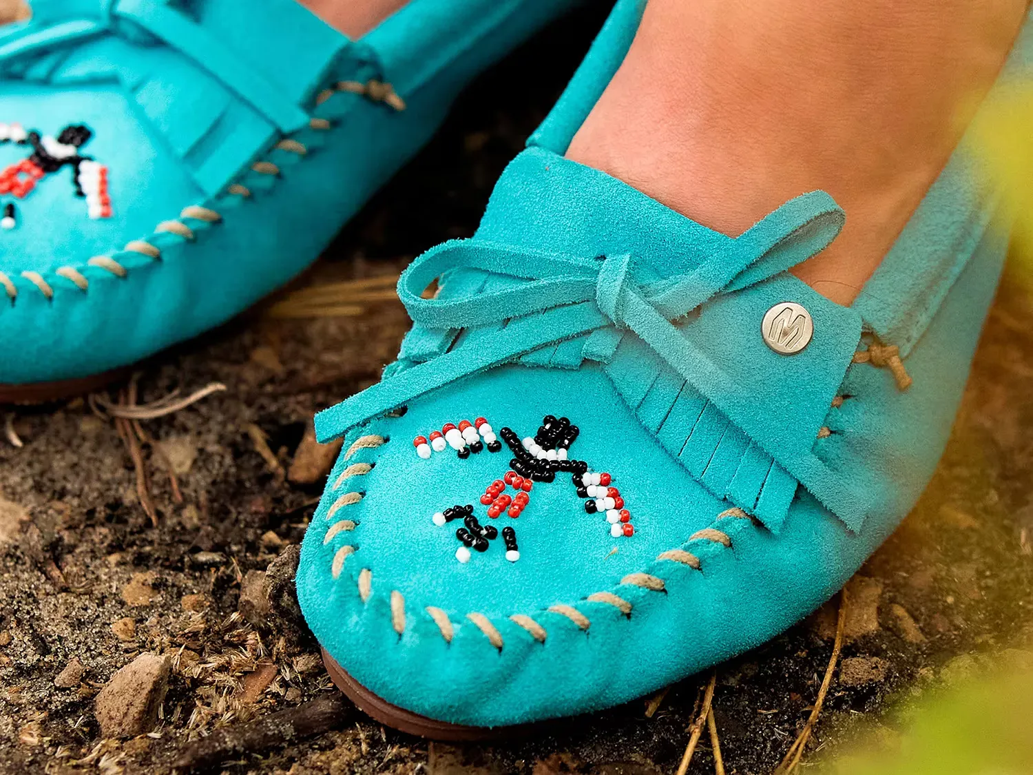 Разработаны дизайнером коренных американцев Люси Скьефте из Миннеаполиса, мокасины Minnetonka Thunderbird Animikii. Изготовлены из мягкой замши, эта пара с бусинами оснащена удобной пенопластовой стелькой и прочной резиновой подошвой для надежной и комфортной посадки.