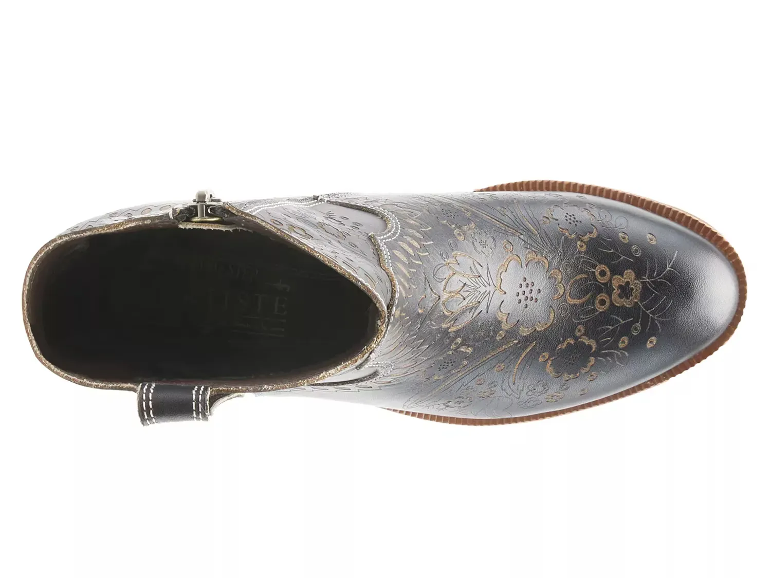 Ботинки-галопы от L'Artiste - это произведение искусства, достойное вашего гардероба. Этот ботинок на молнии украшен веточками нежных листьев и цветами, которые великолепно раскрашены вручную и ручным тиснением. Передний подъем и внешний язычок с акцентами-кабошонами еще больше поднимают уровень моды.