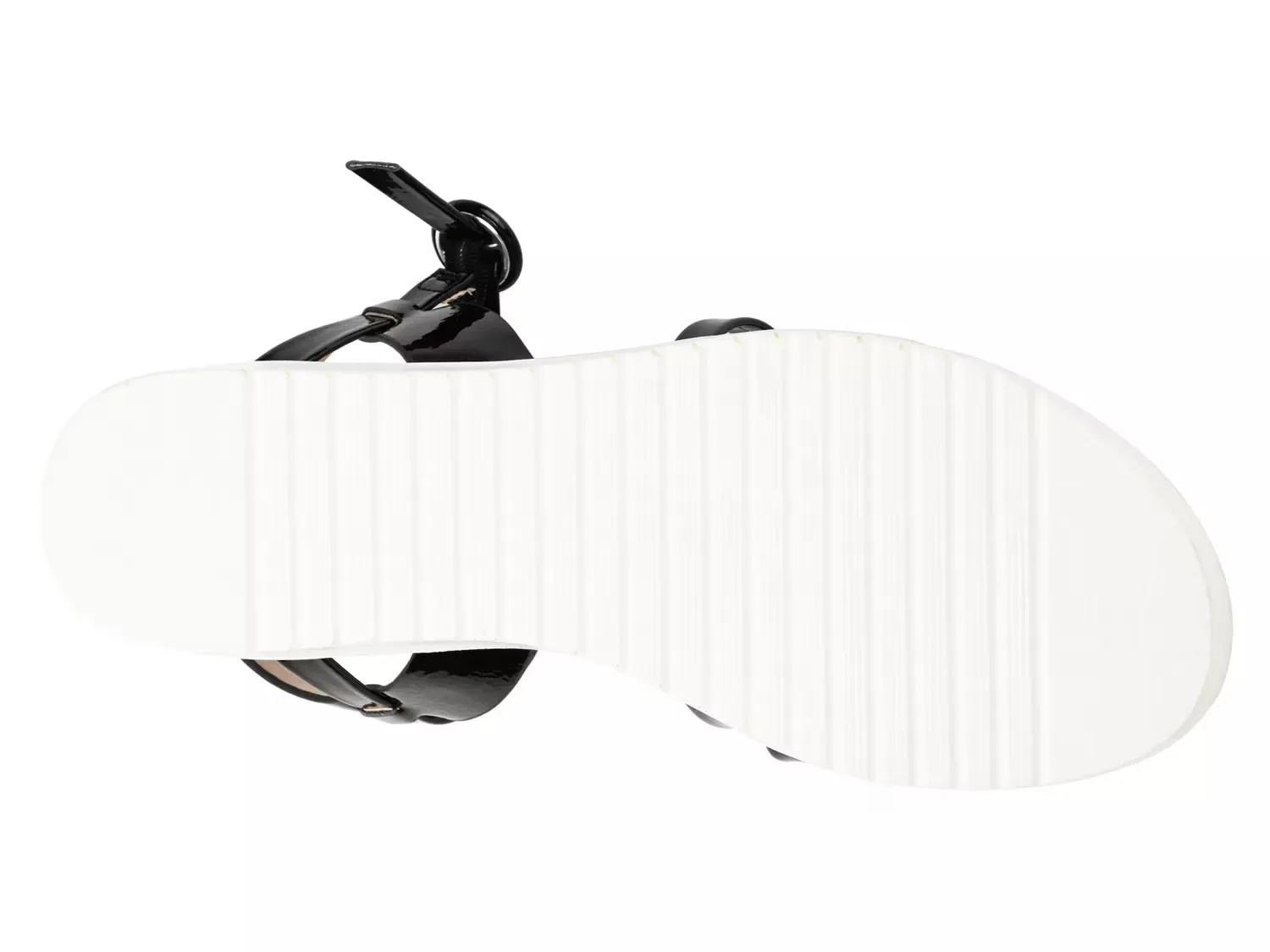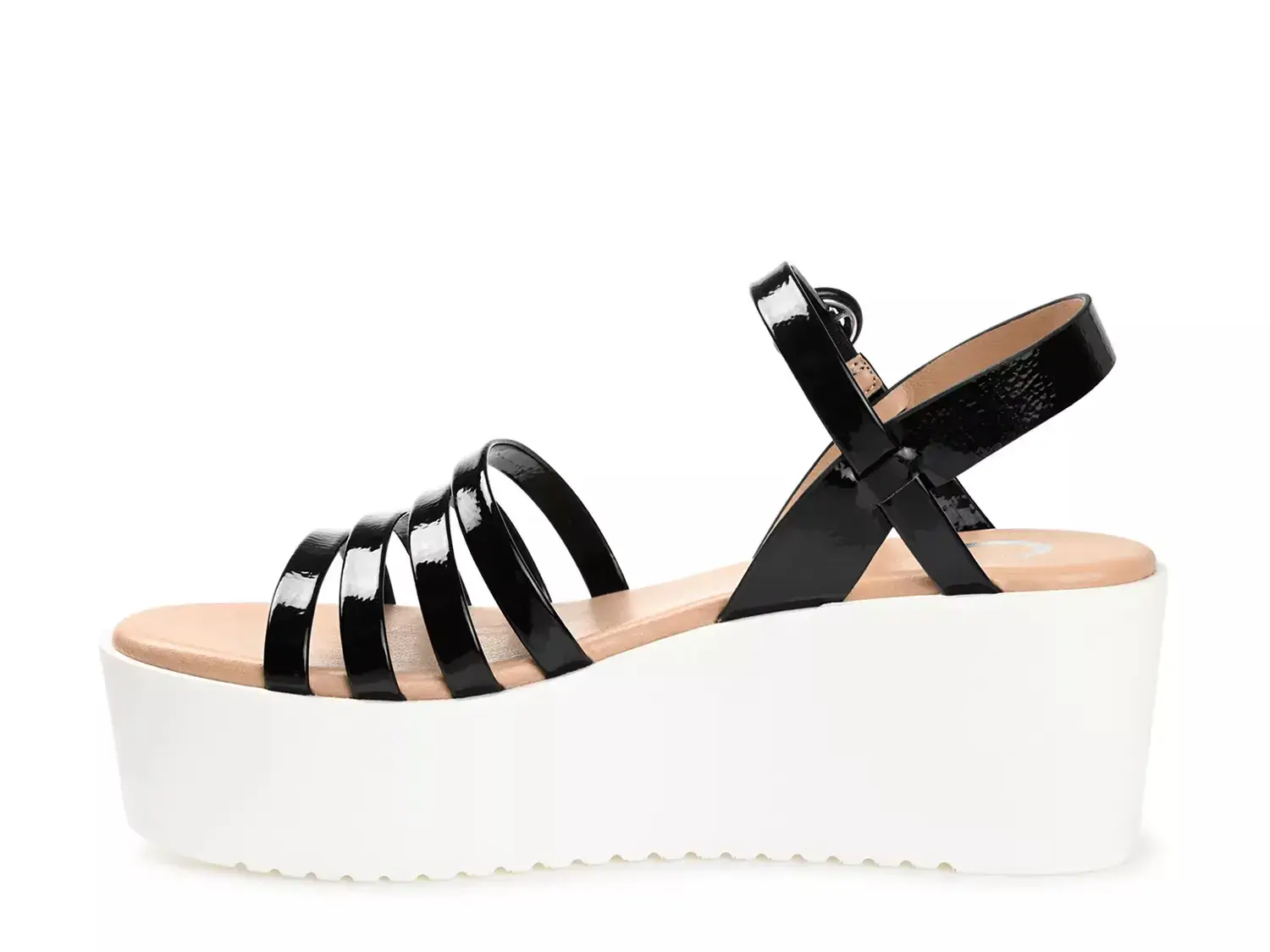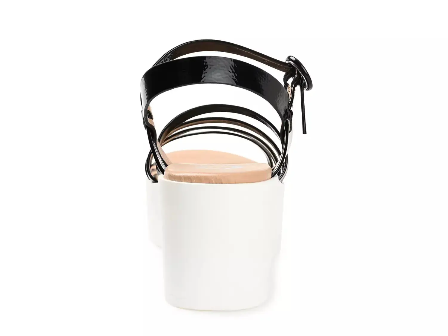 Поднимите свой базовый летний образ с помощью платформенных сандалий Miragge от Journee Collection. Эти wedges-сандалии выполнены на белой платформе, контрастирующей с верху, который изготовлен из запатентованного веганского синтетического материала.