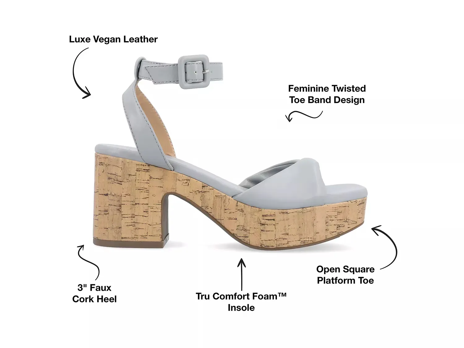 Проявите свой утончённый стиль с сандалиями на платформе Eianna от Journee Collection. Скрученный передний ремешок с квадратным открытым носком и пряжкой на щиколотке образуют верх этой регулируемой сандалии. Искусственный пробковый каблук элегантно завершает образ.