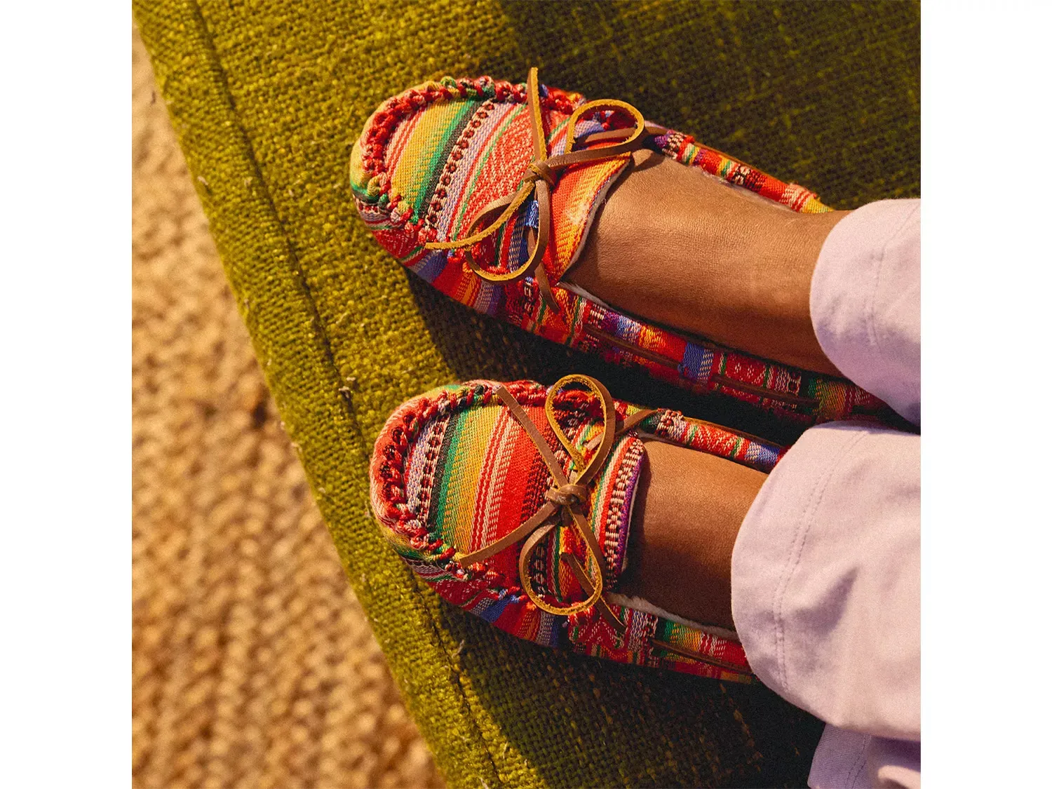 Согревайтесь и оставайтесь стильными в тапочках-мокасинах Cally от Minnetonka. Эта модель с высоким верхом из хлопка с яркими принтами и кружевами из сыромhide по кругу создает эффектный вид, а тонкая резиновая подошва обеспечивает надежное сцепление.