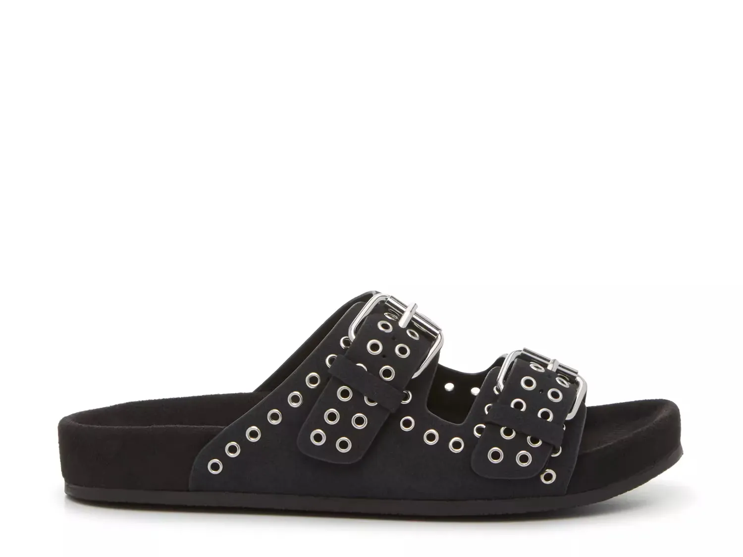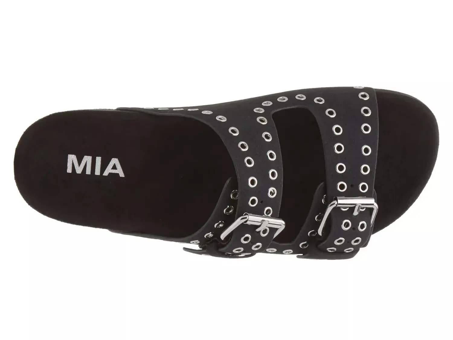 Спортивный стиль сочетается с дерзким в сандалиях Brooklyn от Mia. Эта простая слайд-силуэт выполнена с металлическими люверсами и большими пряжками.