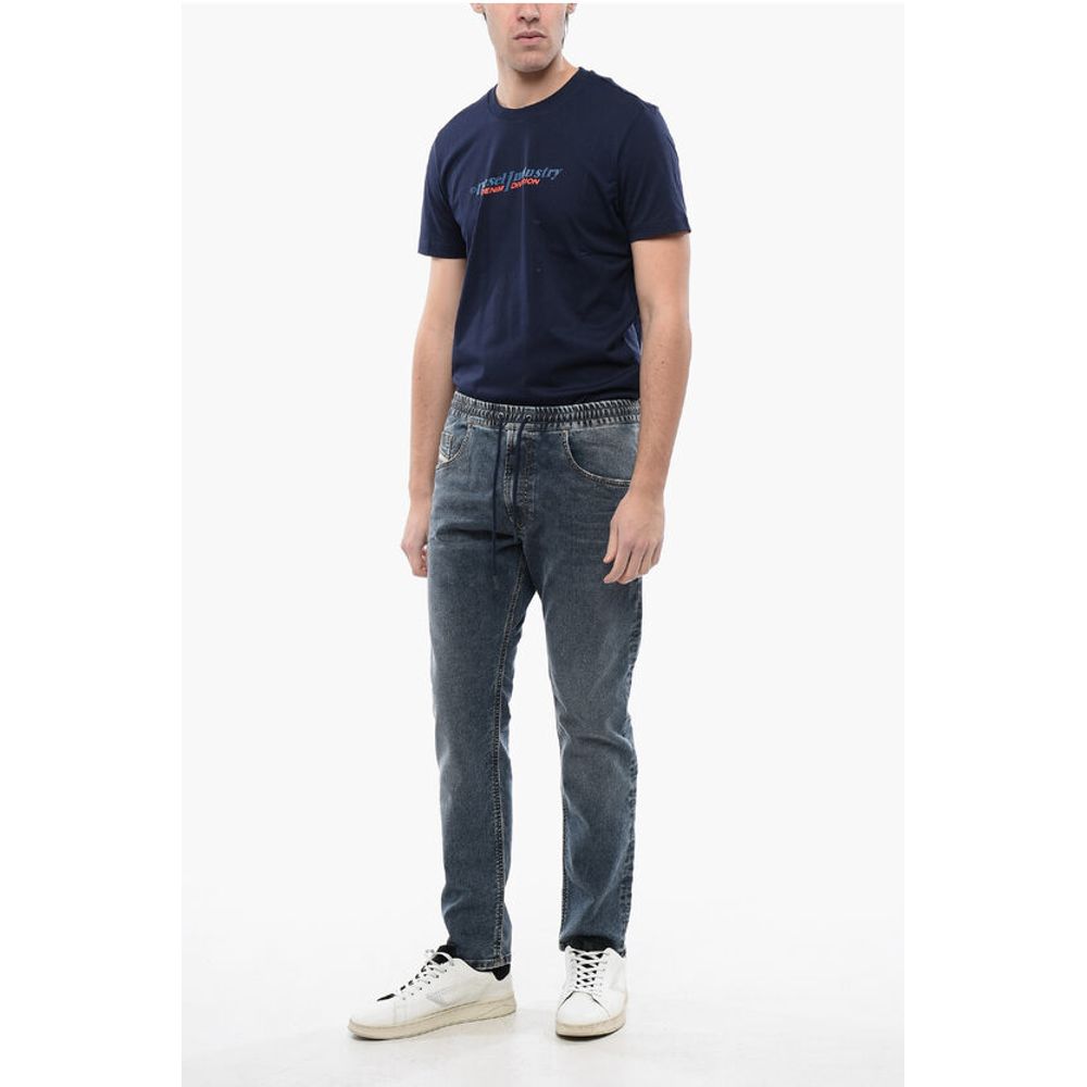 Denim Rules, синий, эластичный деним, 5 карманов, хлопковый деним, логотип, контрастная отделка строчкой, застежка-молния, классический крой, весна-лето, P644227, щиколотка: 16 см